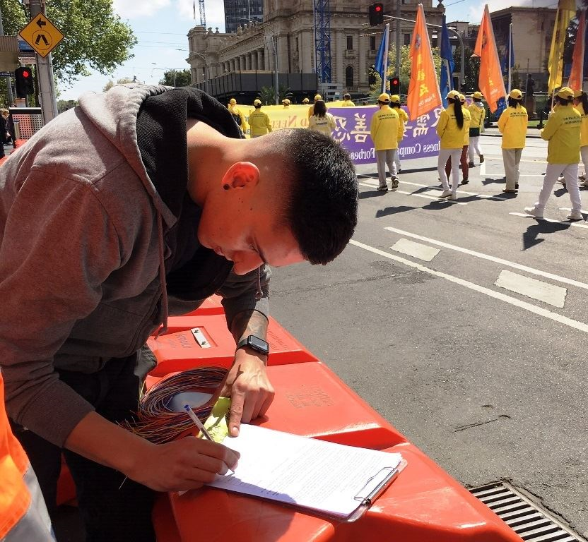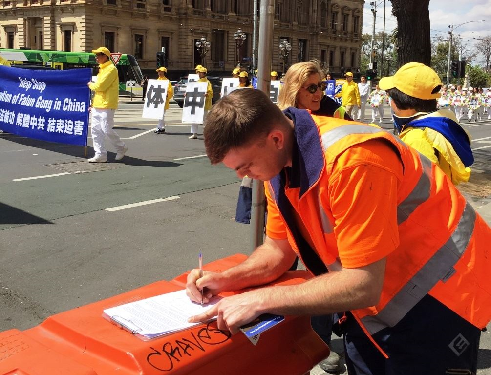 住在塔斯马尼亚州的迈克尔(Michael)在墨尔本旅行三天,他观看游行后表示:“这不象一般的游行,法轮功游行队伍充满美丽的能量,使人感到平静和放松。我认为这种和平的方式,是让更多人知道真相的唯一方法。”