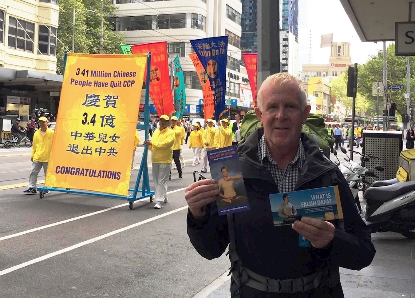 来自维州莫宁顿半岛的居民查理(Charles)当天和儿子一起在市中心游玩,他说:“我看完了整个游行,太棒了。通过这样的游行,民众可以了解到法轮功修炼人的真实信息,可以帮助传播这些信息,所以很多人会想办法支持的。非常感谢,也祝愿法轮功学员一切顺利。”