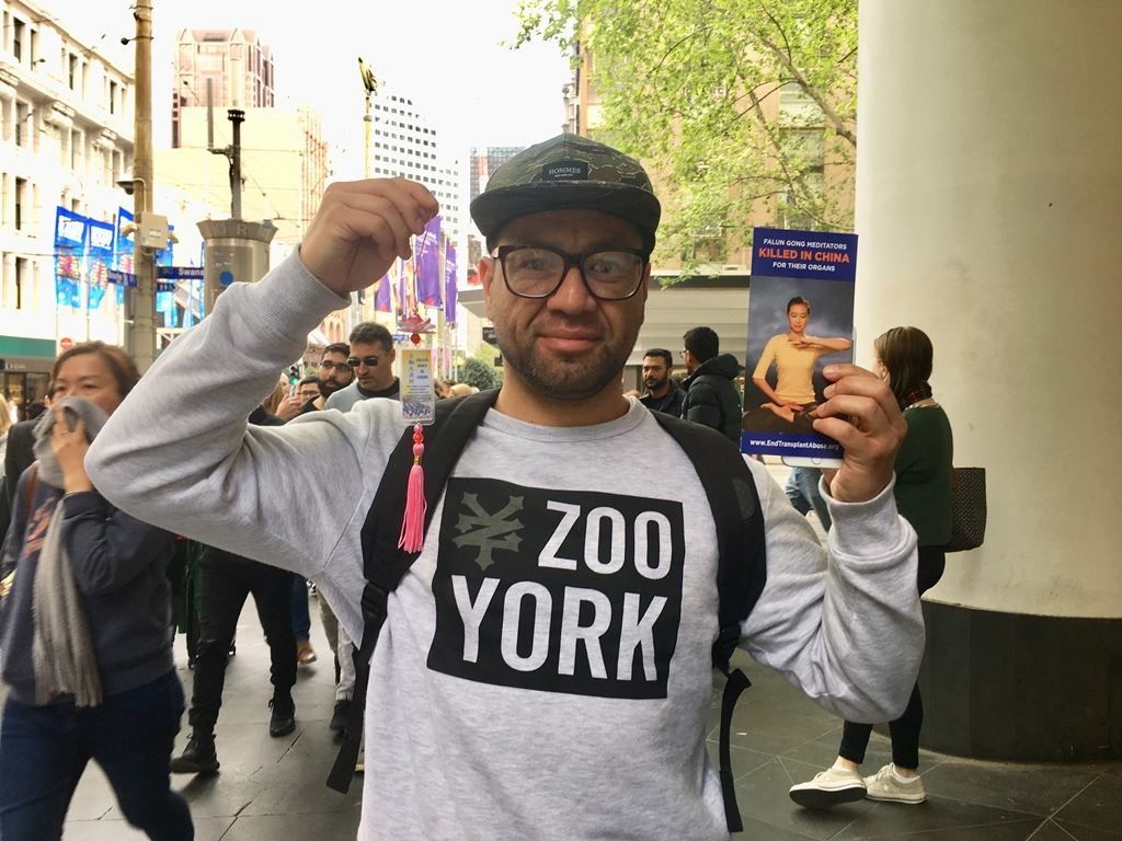 在墨尔本市中心工作的IT专家马特(Matt)观看游行后激动地说:“我第一次听说有关中共活摘法轮功学员器官的惨案后我难过的哭了!”“中共太邪恶了!”“今天我照了一些游行的照片,游行传播的信息很重要,我回去一定会在相关的网站上签字制止活摘,我会在我的社交媒体上帮助传播这些信息!”“法轮功学员们做的非常好,一定要坚持下去!”