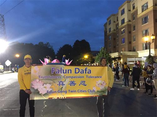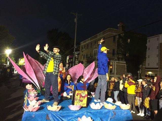 双城法轮功学生社团的巨大花车在游行起点等待出发的时候,一旁的明尼苏达大学乐团成员们整齐地高喊着花车横幅上法轮功的准则——“真、善、忍”三个字。几十人在明尼苏达大学的吉祥物花栗鼠(Goldy Gopher)的指挥下,不断重复高喊着“我们信仰什么?‘真、善、忍’三个字”,有几分钟之久,场面甚是温馨感人。道路另一侧的明尼苏达大学拉拉队成员们也赞叹着“真、善、忍”三字的美好。
