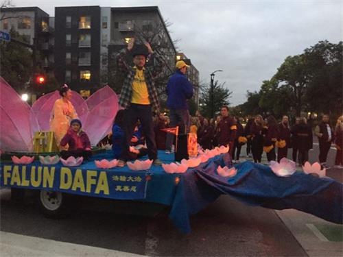 游行开始了,巨大莲花车里穿着艳丽唐装的仙女微笑着向观众招手,莲花周围的法轮功学员们展示着优美舒缓的五套功法。游行观众有的好奇地跟着花车上的学员做起了同样的动作,很多观众高兴地接受了法轮功功法介绍的资料。观看游行的人们非常喜欢法轮功学员制作的纸莲花,游行进行一半左右就散发完毕,法轮功学员们继续以精美的书签作为礼物赠送给观众。