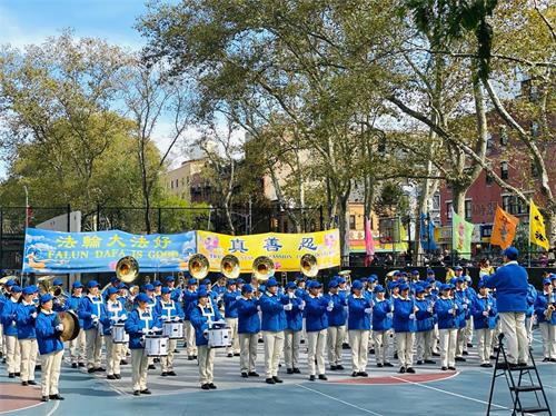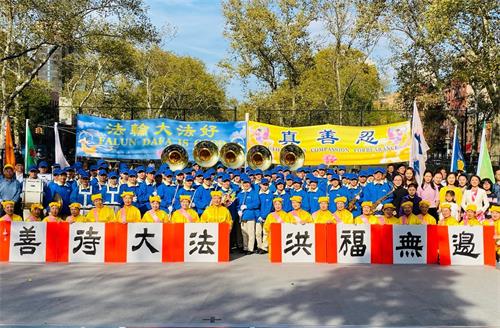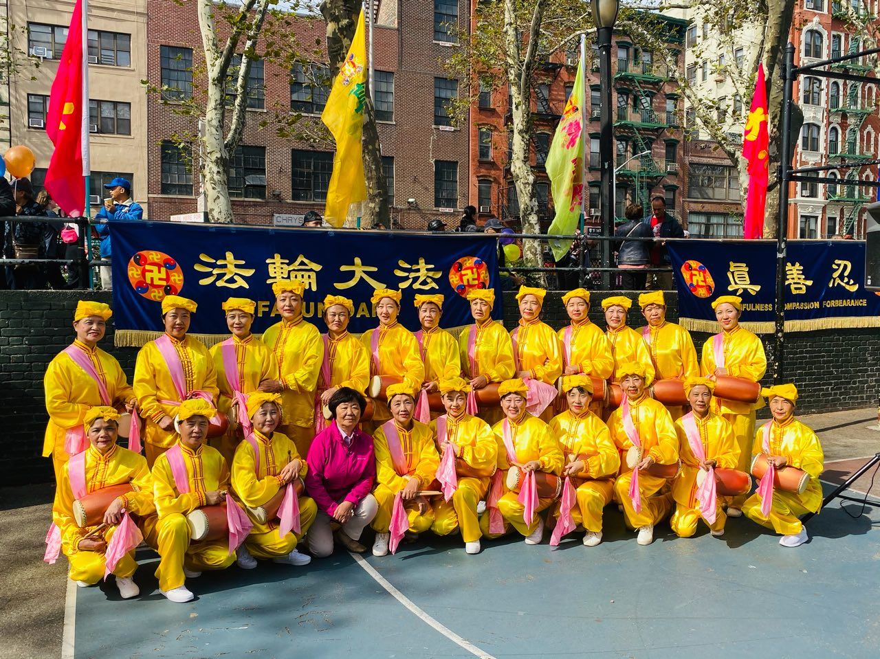 天国乐团为庆典拉开序幕,带来“法轮大法好”、“神圣的歌”、“法鼓法号震十方”等乐曲,气势磅礴的军乐散发着纯真纯善的能量,响彻在华埠繁华街市的上空。庆祝活动从上午十一点一直进行到下午三点:舞龙舞狮、腰鼓表演、法轮功功法演示;歌曲演唱;钢琴、琵琶、二胡乐器演奏等等,精彩纷呈,令人目不暇接,吸引了华埠民众和游客纷纷聚拢过来,静静观赏。