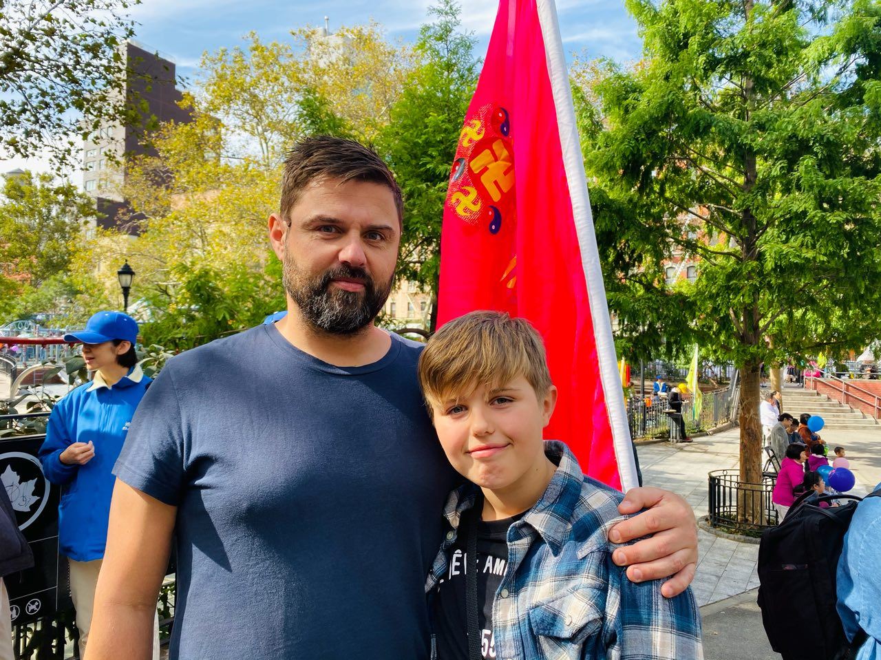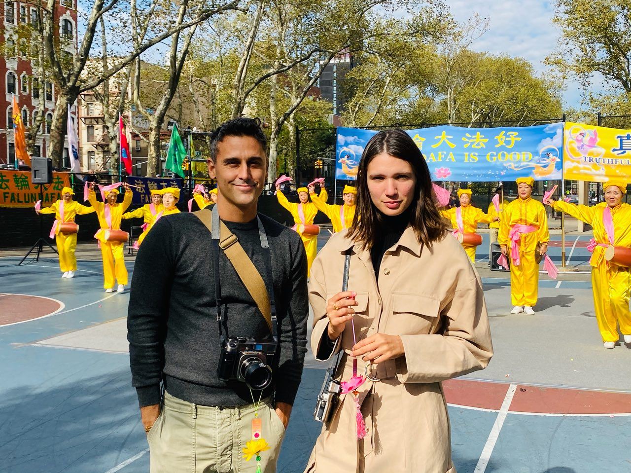 来自巴塞罗那的阿拉蕾(Arale)和马丁(Martin),他们拍摄了多个学员的节目,他们认为“这个演出如此美好”,并在收下印有中英文“法轮大法好”的莲花吊坠后,在腰鼓队表演现场前拍照留念。