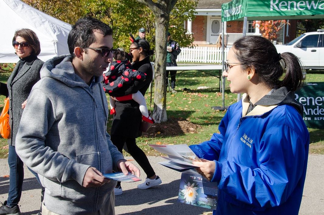 艾莉莎(Alisha)女士和她的朋友前来参加南瓜节活动,在听学员介绍法轮功的基本情况后表达了浓厚的兴趣,她当场跟随学员学炼了法轮功的功法,并留下自己的联络信息希望参加今日在多伦多举办的义务教功班,她说:“太感谢你们了,真是太好了!”
