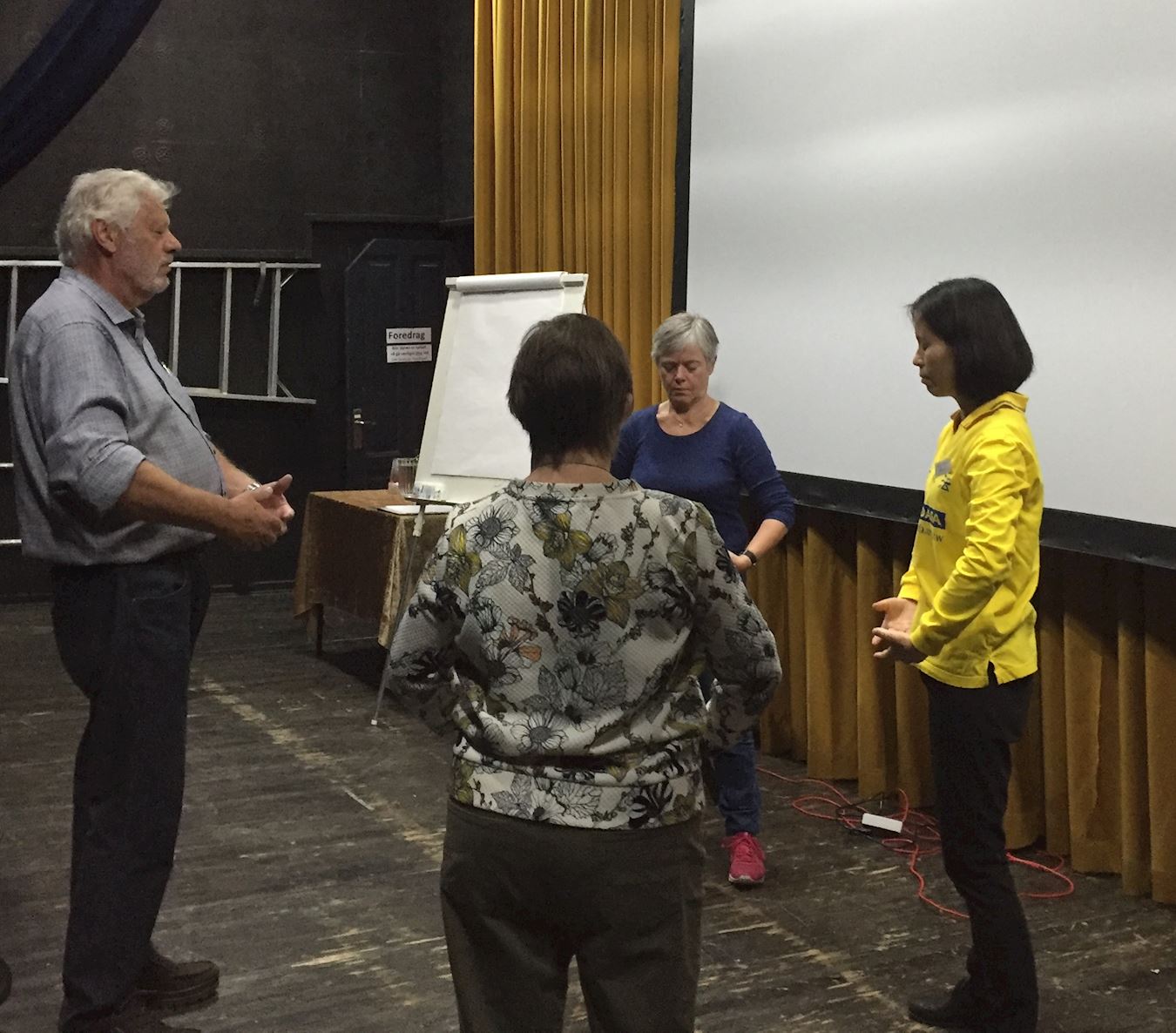 这是法轮功学员第一次参加斯基沃市健康博览会,民众纷纷来到展位前咨询。汤姆(Tom)和碧基特 (Birgitte)双双来到展位前,学员向他们介绍,法轮功,又称法轮大法,是一种古老的修炼方法,按照“真善忍”做好人,并有缓、慢、圆的五套功法,使人达到道德回升,身体健康。法轮功弘传世界一百多个国家和地区。他们听后很高兴,决定试一试。