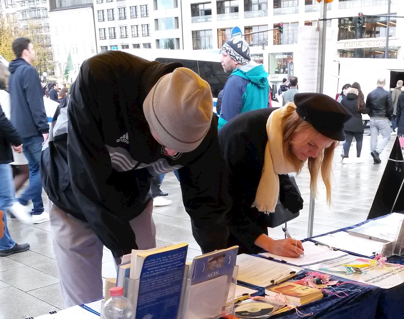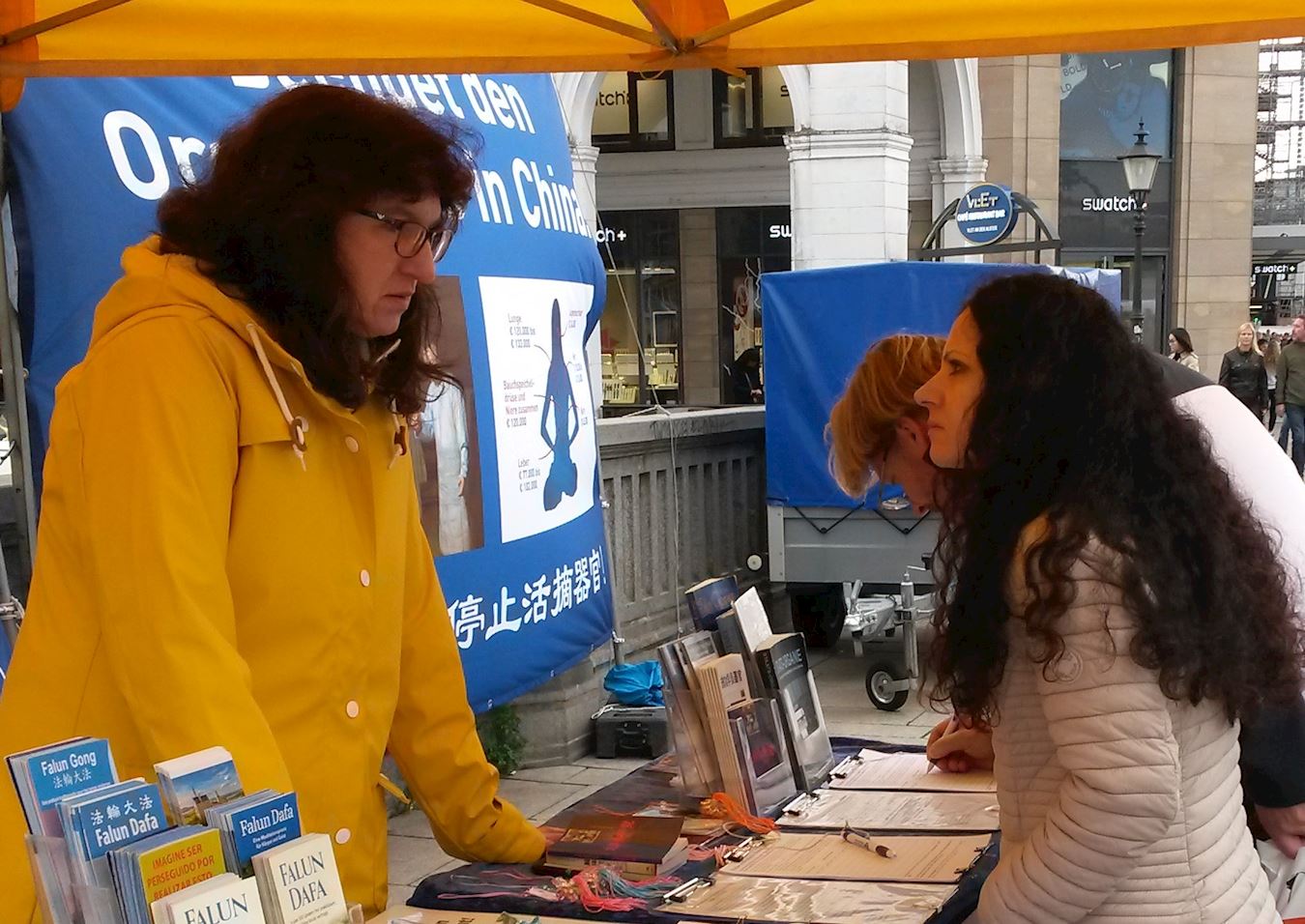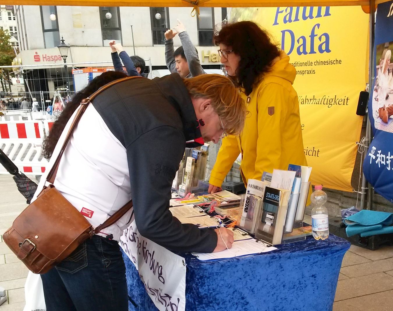 一位从德国南部来的女士来到展桌,在两个不同的征签表上签了字。她说她以前没有听说过法轮功学员被迫害的事,但是当她走上前稍微了解一下的时候,马上就知道自己应该签名。她看到很大的横幅上写着“在中国正在发生器官强摘”几个字,说:“这是完全不允许发生的,人们必须制止这件事情。”