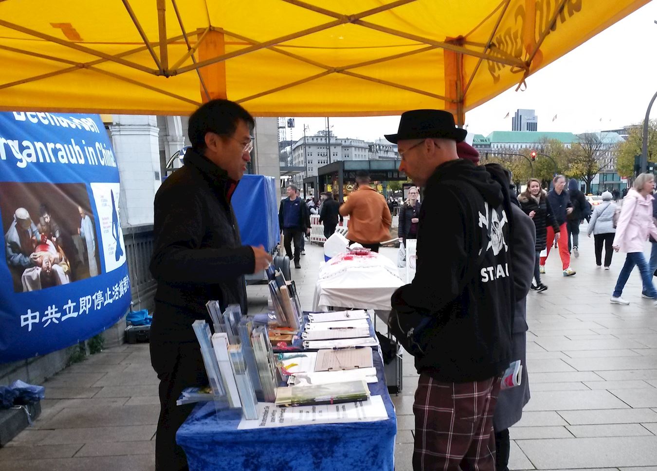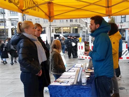有两位五十岁左右来自斯图加特的游客,他们想知道中共对法轮功的迫害有没有法律依据。当他们得知这场迫害完全是非法,而且法轮功学员的器官完全是在受害人本人反对的情况下被强行摘取的时候,其中的一位说,“我马上就相信这一点了。因为在(中共统治下的)中国,一切都是有可能的。”她俩在征签表上签了字,又和法轮功学员聊了一会儿。她们一一看过桌上摆出的图片和各类信息,最后临别时向学员表示感谢,并祝他们一切顺利。