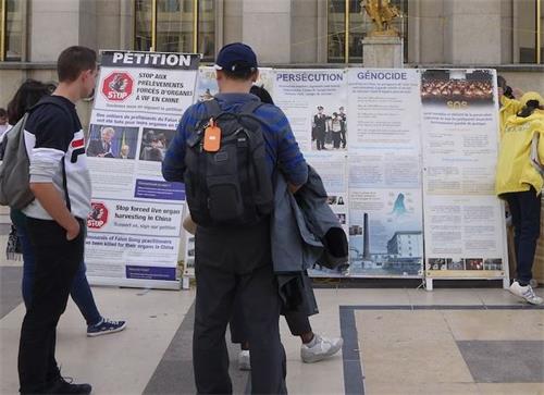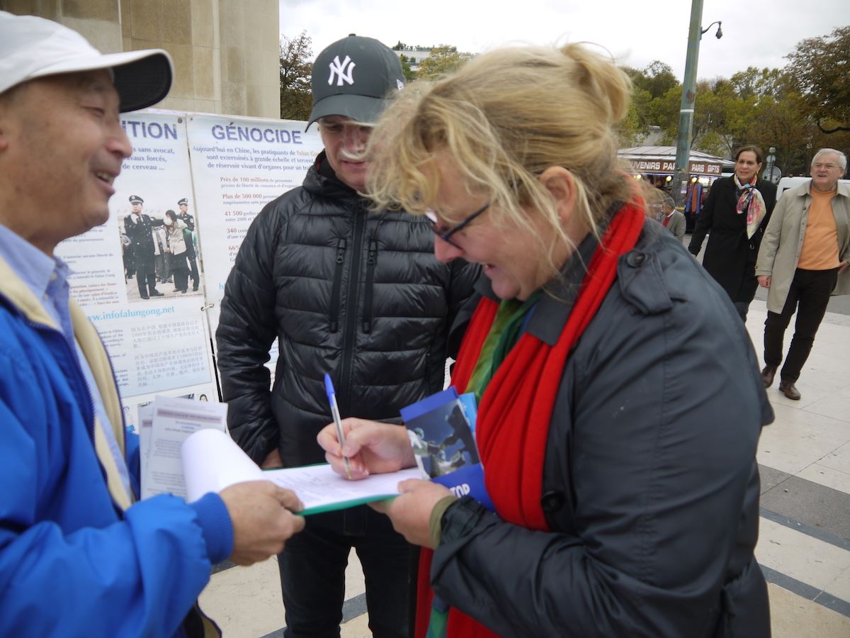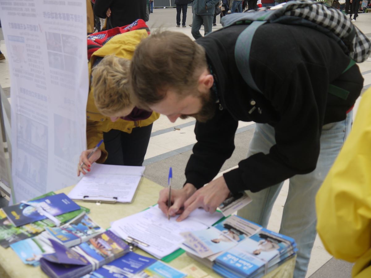 游人得知在中国修炼法轮功真、善、忍会遭迫害,酷刑折磨,甚至被强行摘取器官,他们震惊不已,纷纷在反迫害征签表上签字,希望早日停止这场迫害。