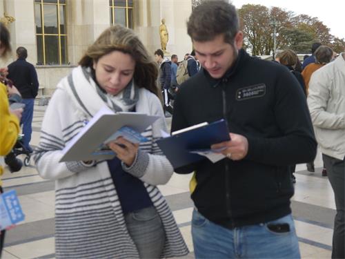 游人奥罗拉弗拉芒(Aurore Flamant)说:“我很恐怖、震惊,今天还在迫害法轮功学员,这样的迫害是卑鄙、无耻的。我常常祈祷,我要祈祷世间更多的和平,尤其是人们的意识要打开,我们还有很多的要做的事。我相信一切都会改变的。”她鼓励法轮功学员:“加油!”