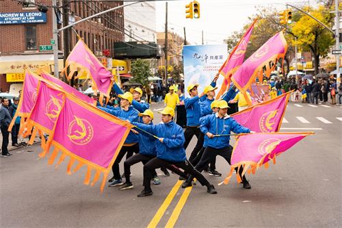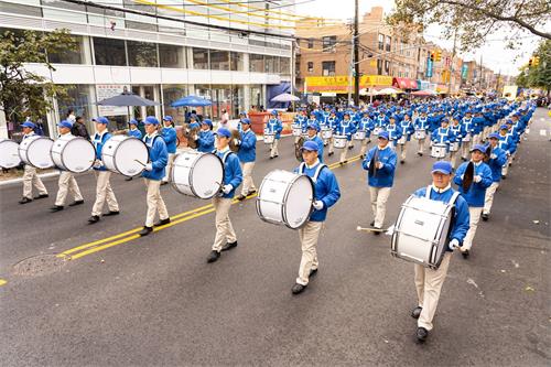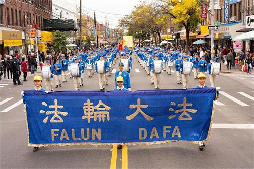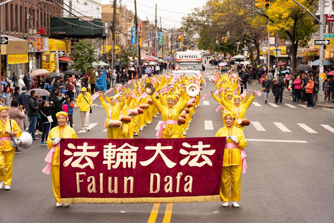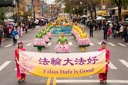第一方阵是“法轮大法好”,走在最前面的是闻名遐迩的天国乐团。他们气宇轩昂、踏着整齐有力的步伐,用壮阔的乐音为游行打头阵。紧随其后的是巨型《转法轮》书模、巨型旋转法轮模型、舞龙队、法轮功功法演示队、莲花船队、彩旗队等。