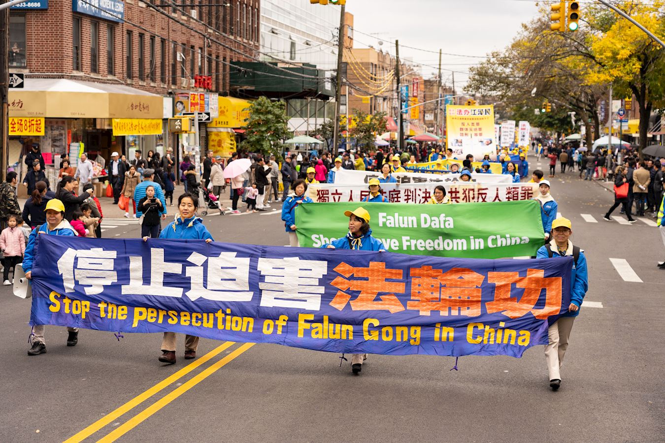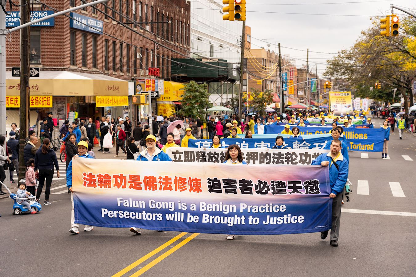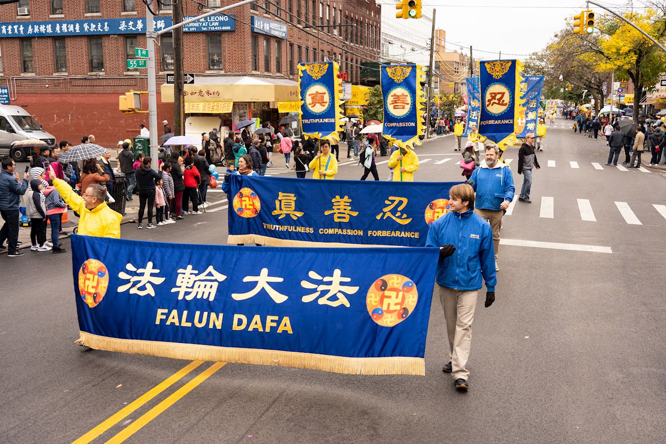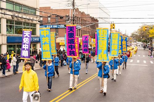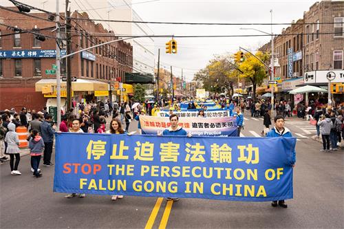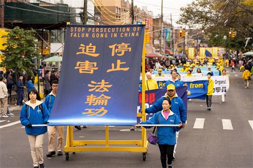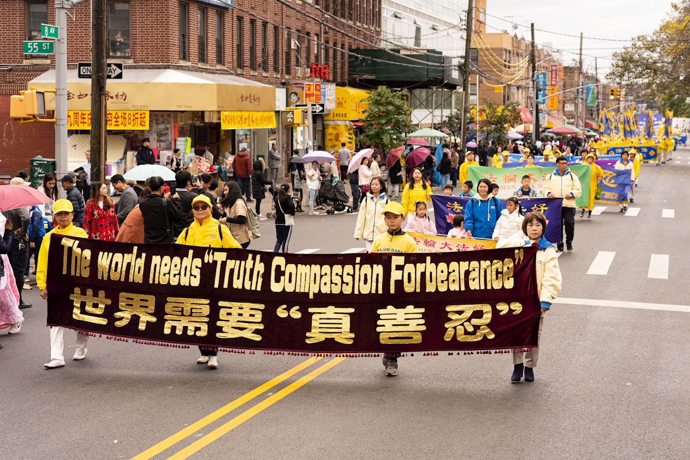 游行分为三部份:“法轮大法好”,“停止迫害法轮功”、“三:退.保平安”。盛大的游行队伍行走在布鲁克林华人社区最繁忙的商业街上,从六十八街走向四十二街,覆盖了最主要的街面。上百条中英文大横幅、竖旗及巨幅展板,传递着真相与祝福:“法轮大法好”、“世界需要真善忍”、“法轮大法洪传100多个国家地区”、“法轮大法使人心向善 道德回升”、“停止迫害法轮功”、“中共活摘法轮功学员器官 惨绝人寰必遭天谴”、“法办江泽民”、“解体中共 制止迫害”、“共产主义的终极目的是毁灭人类”、“共产主义邪灵正在统治我们的世界”、“回归传统 道德回升”、“·九·评*神威 天灭中共”、“ 三:退.保命保平安”等。