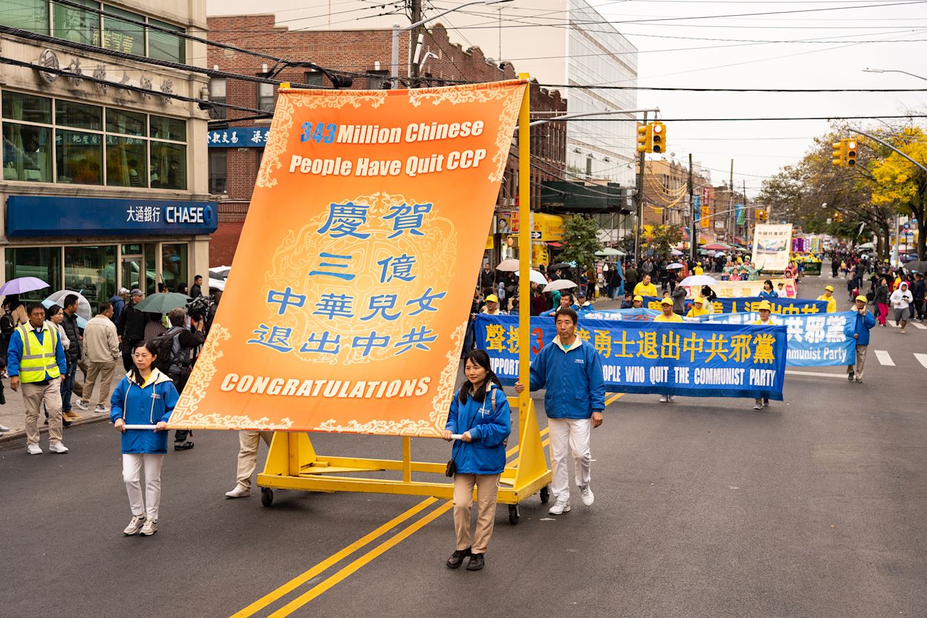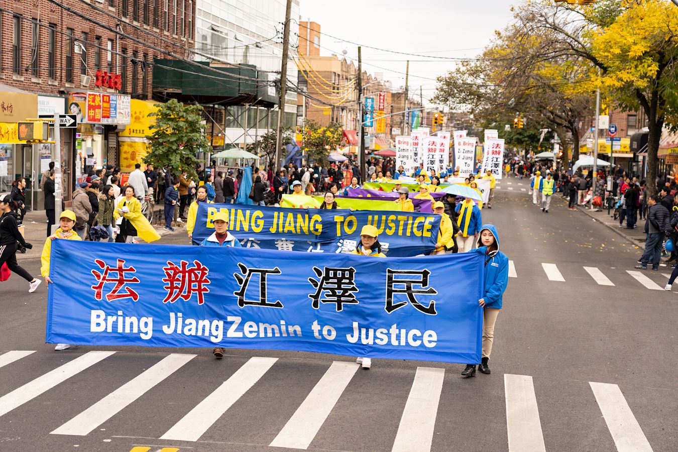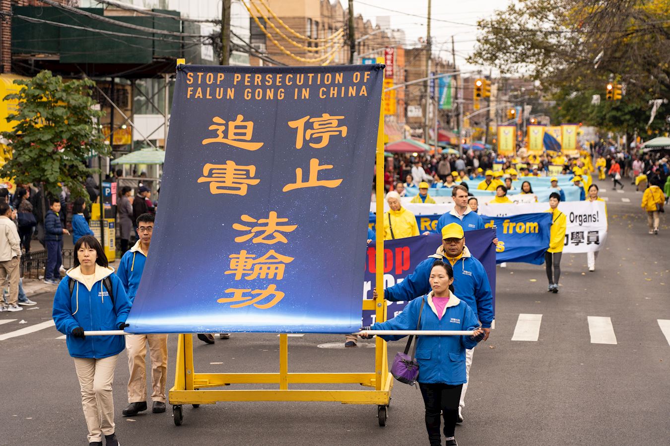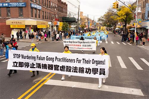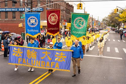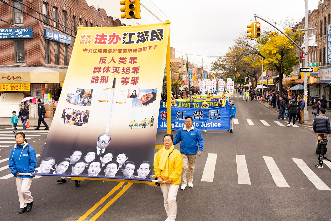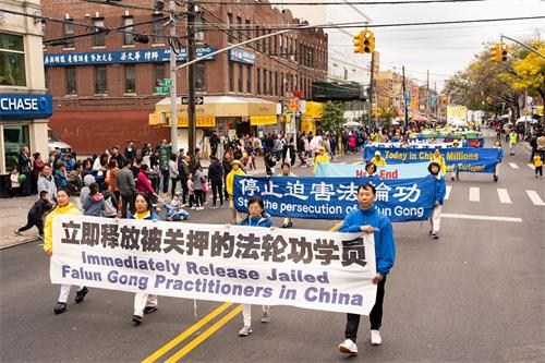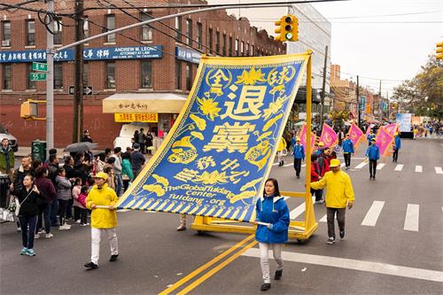 游行分为三部份:“法轮大法好”,“停止迫害法轮功”、“三:退.保平安”。盛大的游行队伍行走在布鲁克林华人社区最繁忙的商业街上,从六十八街走向四十二街,覆盖了最主要的街面。上百条中英文大横幅、竖旗及巨幅展板,传递着真相与祝福:“法轮大法好”、“世界需要真善忍”、“法轮大法洪传100多个国家地区”、“法轮大法使人心向善 道德回升”、“停止迫害法轮功”、“中共活摘法轮功学员器官 惨绝人寰必遭天谴”、“法办江泽民”、“解体中共 制止迫害”、“共产主义的终极目的是毁灭人类”、“共产主义邪灵正在统治我们的世界”、“回归传统 道德回升”、“·九·评*神威 天灭中共”、“ 三:退.保命保平安”等。