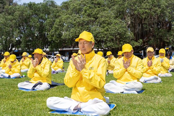 当音乐声响起,学员们舒展优美的动作,吸引了很多人驻足观望、拍照录像。还有人来了解什么是法轮功,如何学习法轮功,以及中共为什么要迫害如此祥和善良的民众。