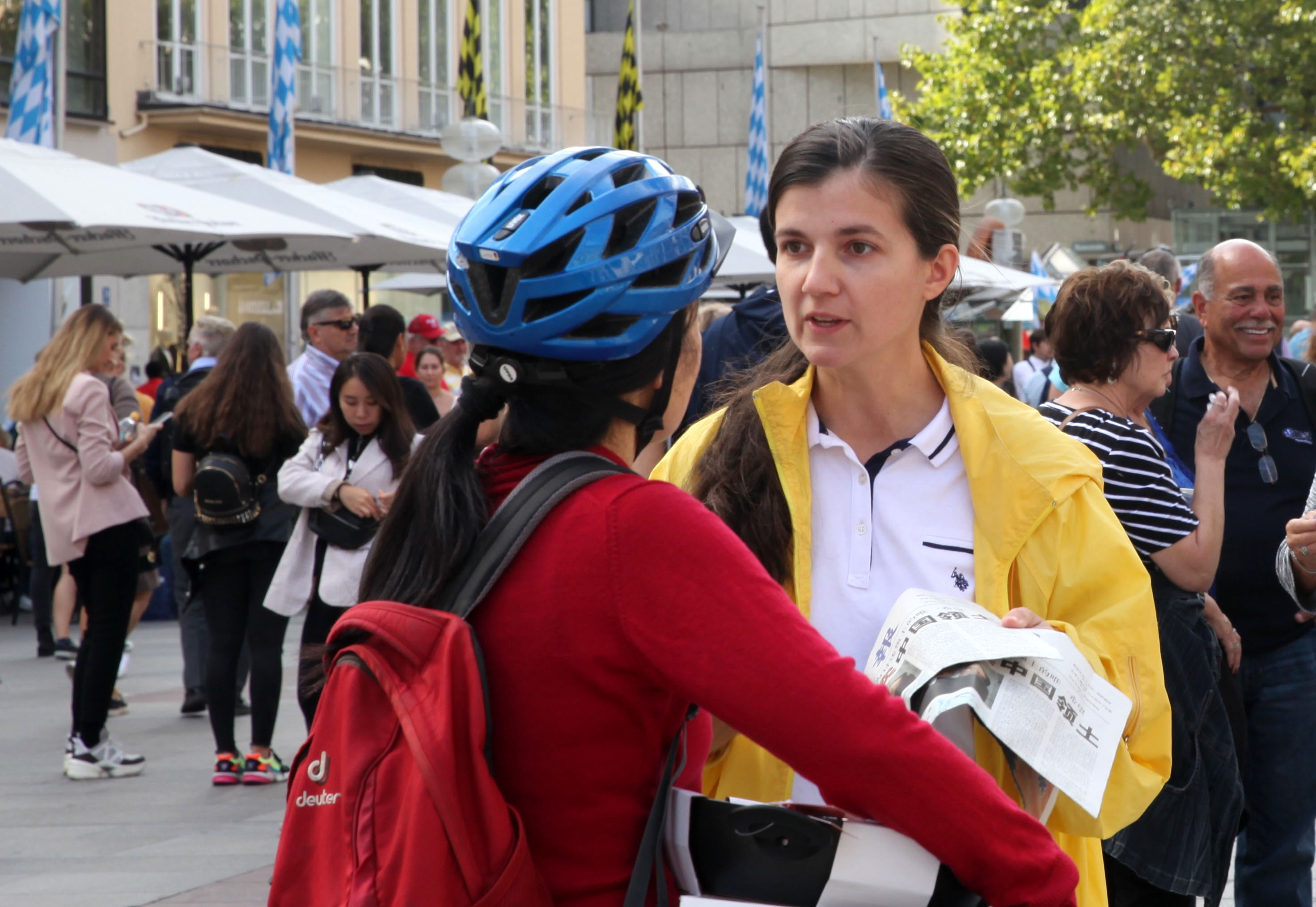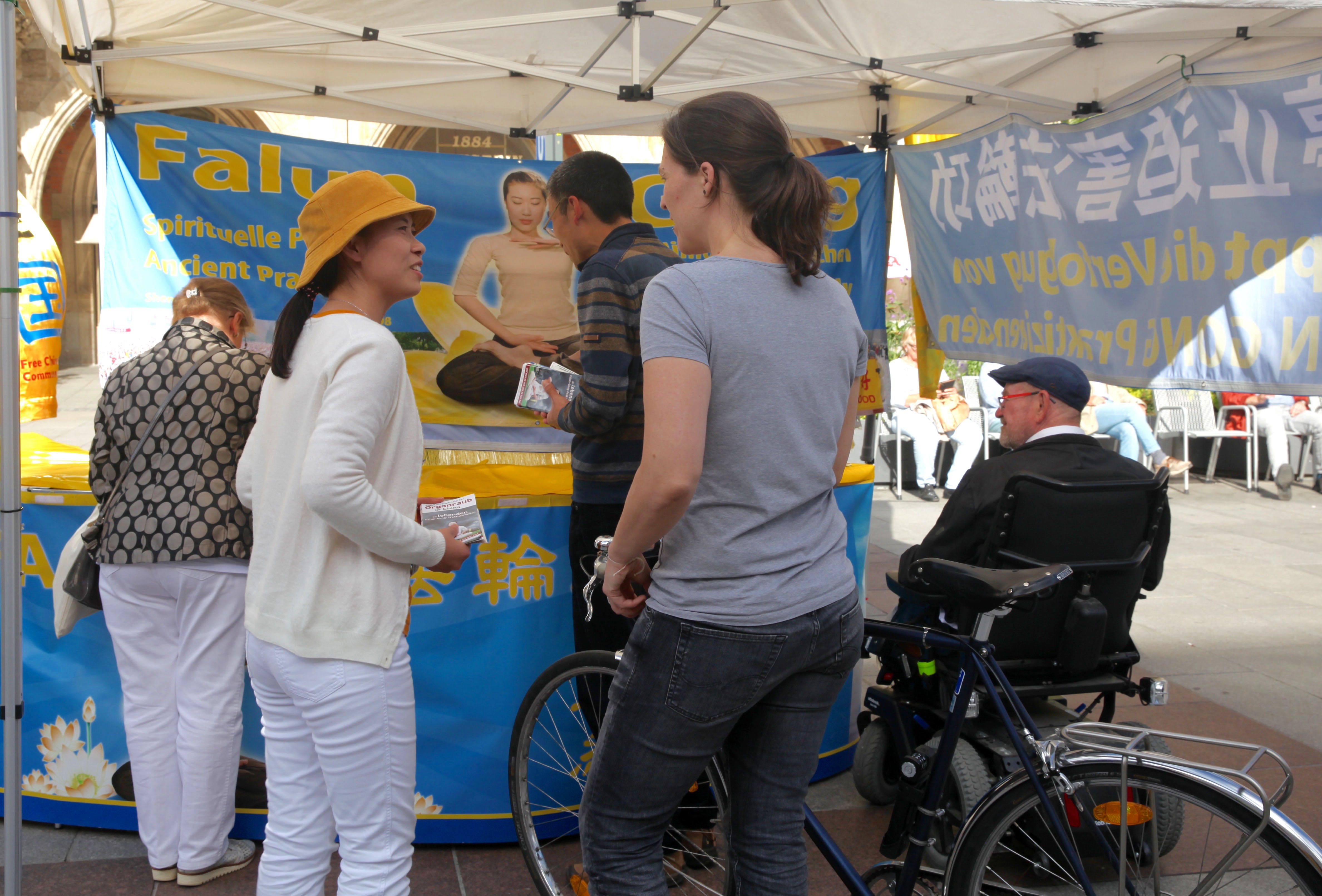 二零一九年十月一日,在玛琳广场上,展示中共活体摘取法轮功学员器官的大型画面震惊了过往民众。人们驻足观看展板,并跟法轮功学员交谈。他们中有些人直接走到展台前要求签名。当天也有不少大陆游客和当地华人,不少人跟法轮功学员交谈,有的还当场表示退出中共各种组织。