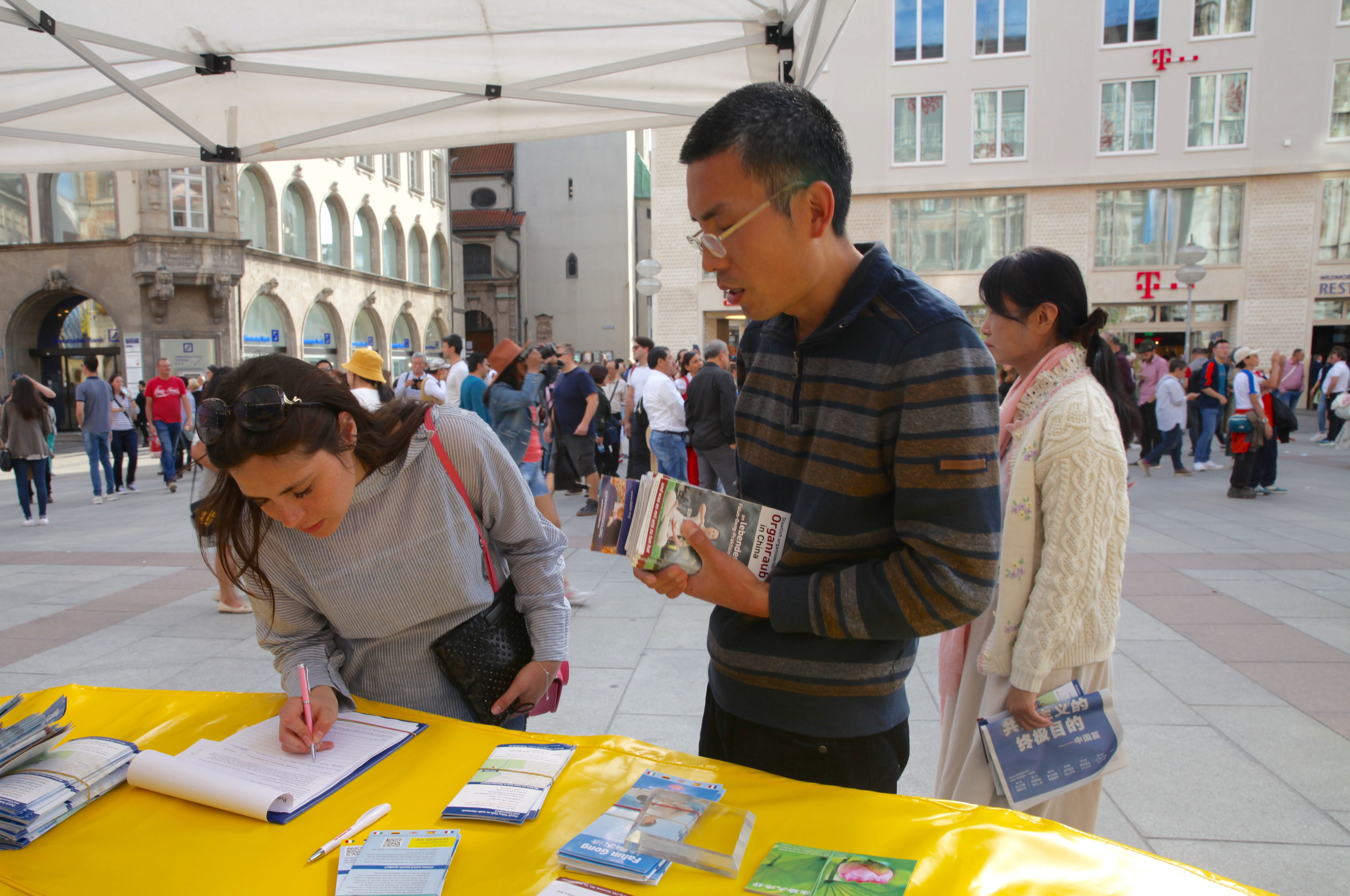 格尔陶特(Gertraud)女士径直走到展台前在制止迫害请愿书上签名,她说:“读了相关的资料我感到很震惊,怎么还有这样的事情(中共活摘法轮功学员器官)发生。那些建立在他人痛苦之上、为满足自己前往中国(移植器官)的人,不能这么做。”