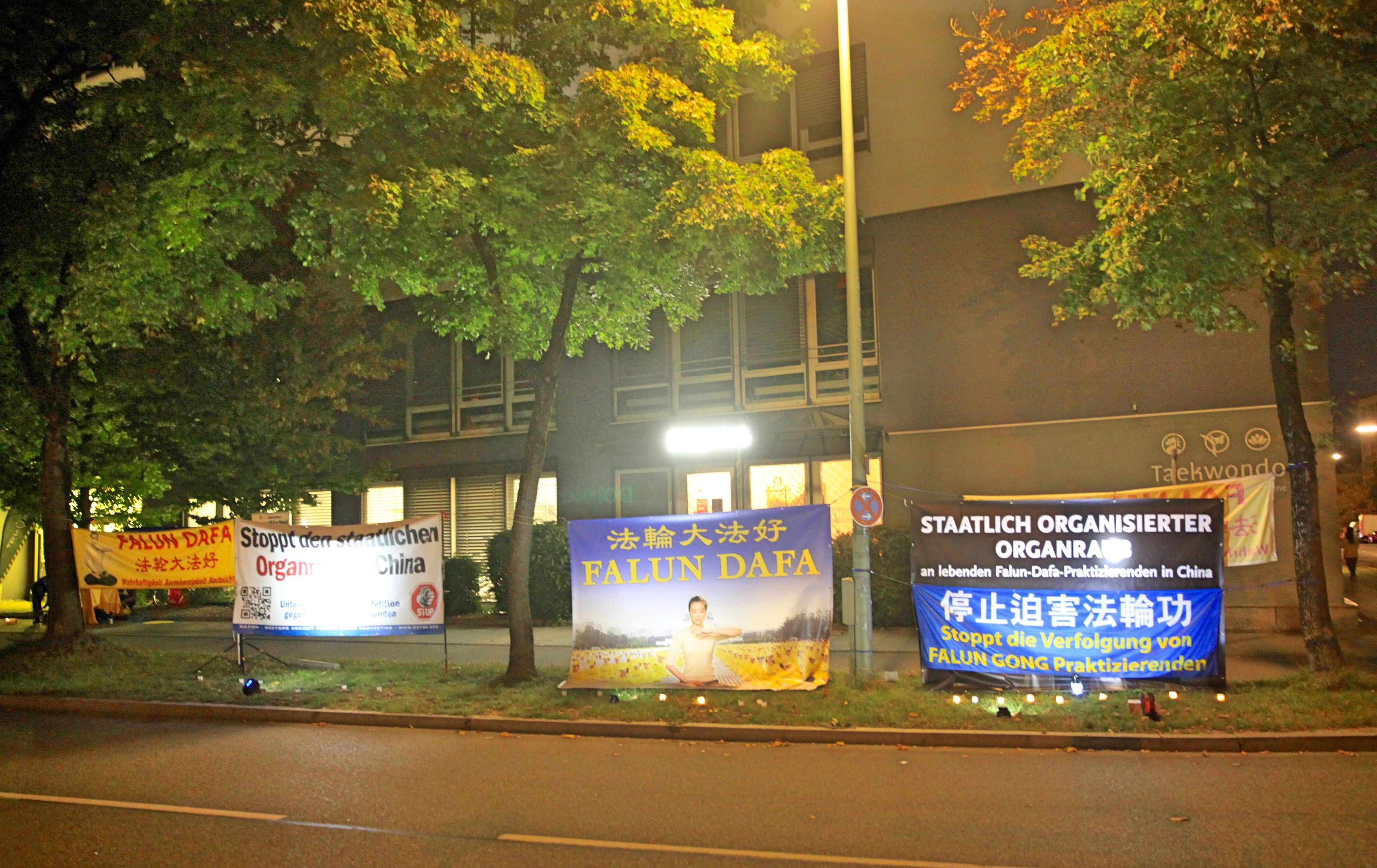二零一九年九月二十七日下午至深夜,法轮功学员在慕尼黑中领馆前举办烛光悼念活动,当时中领馆正举办晚宴,邀请了很多中德宾客。步行和开车到领馆的人,都可以看到大型的“法轮大法好”、“停止迫害法轮功”、“中共活体摘取法轮功学员器官”等横幅。