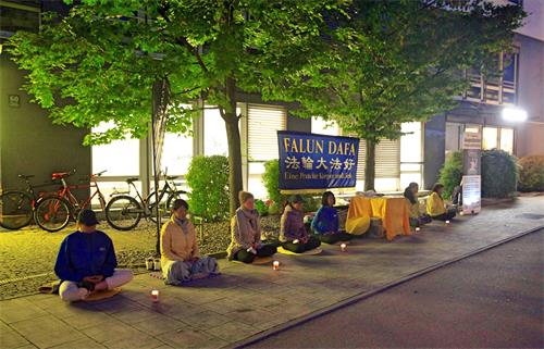 ![]() 图6~7:二零一九年九月二十七日夜晚,德国法轮功学员在慕尼黑中领馆前,悼念被中共迫害致死的大陆法轮功学员。 |