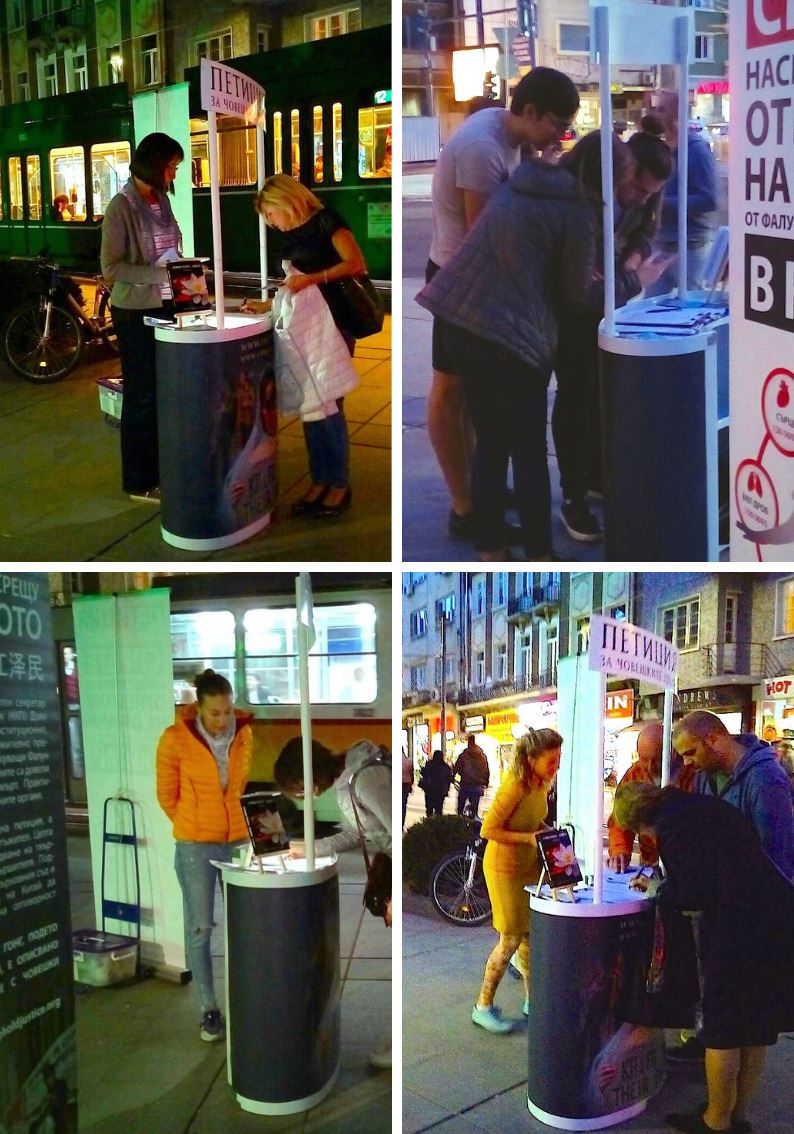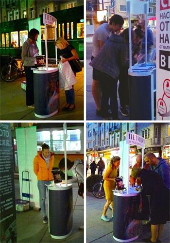 路过广场的行人川流不息,很多人在匆忙之中都留意到了在雕塑像下面立着的两个醒目的落地幅,左边用中文和保加利亚语写着“法办中共恶首江泽民”,右边用保加利亚语写着“ 停止对中国大陆的法轮功学员强行活摘器官“。人们都被这两幅醒目的落地幅所吸引,渐渐地广场变成了人们聚焦的中心。学员们在广场上派发真相传单,并向人们讲述二十年来发生在中国大陆的残酷迫害与中共强行活摘法轮功学员器官的事实。人们纷纷签名支持法轮功学员,谴责中共的罪恶。