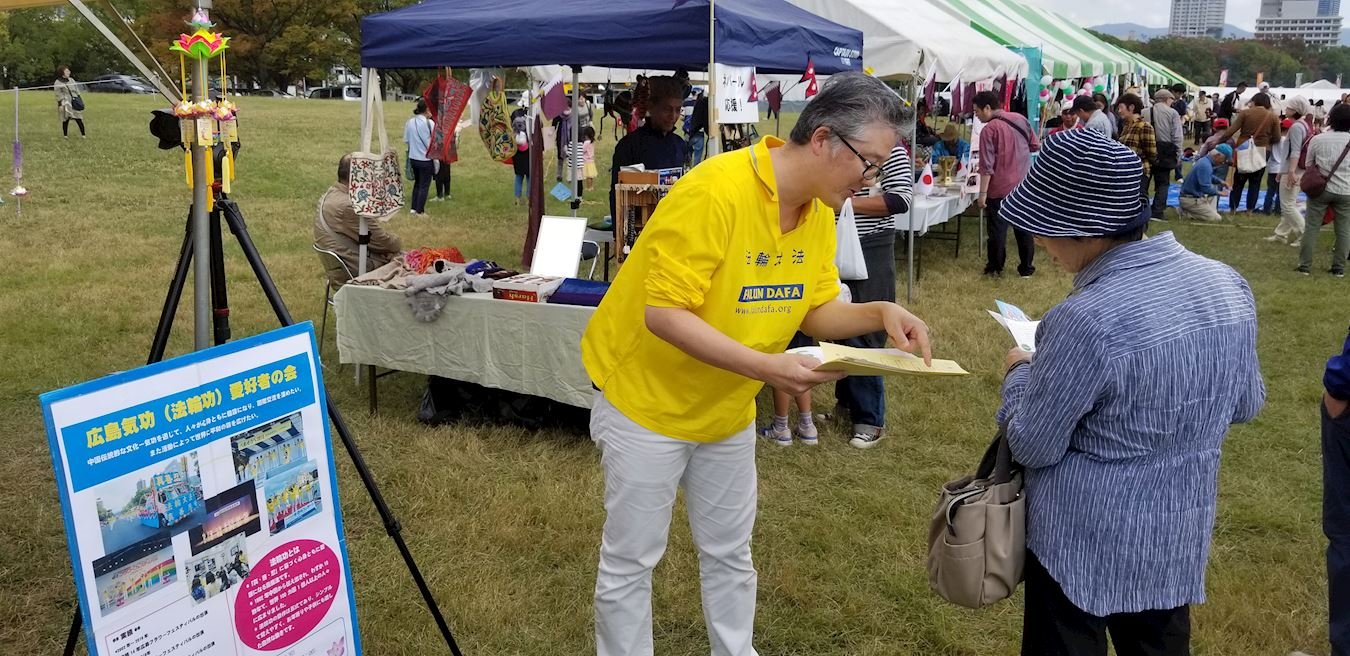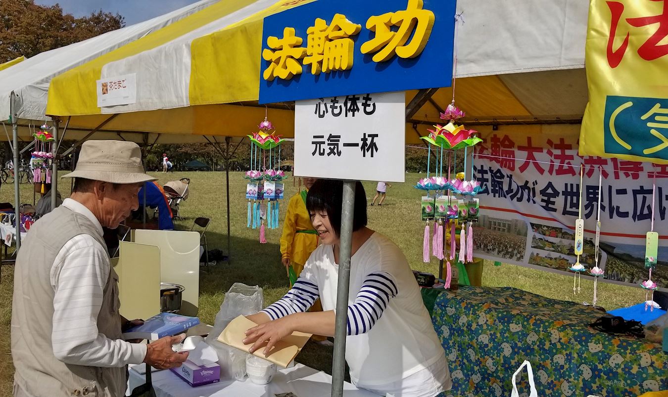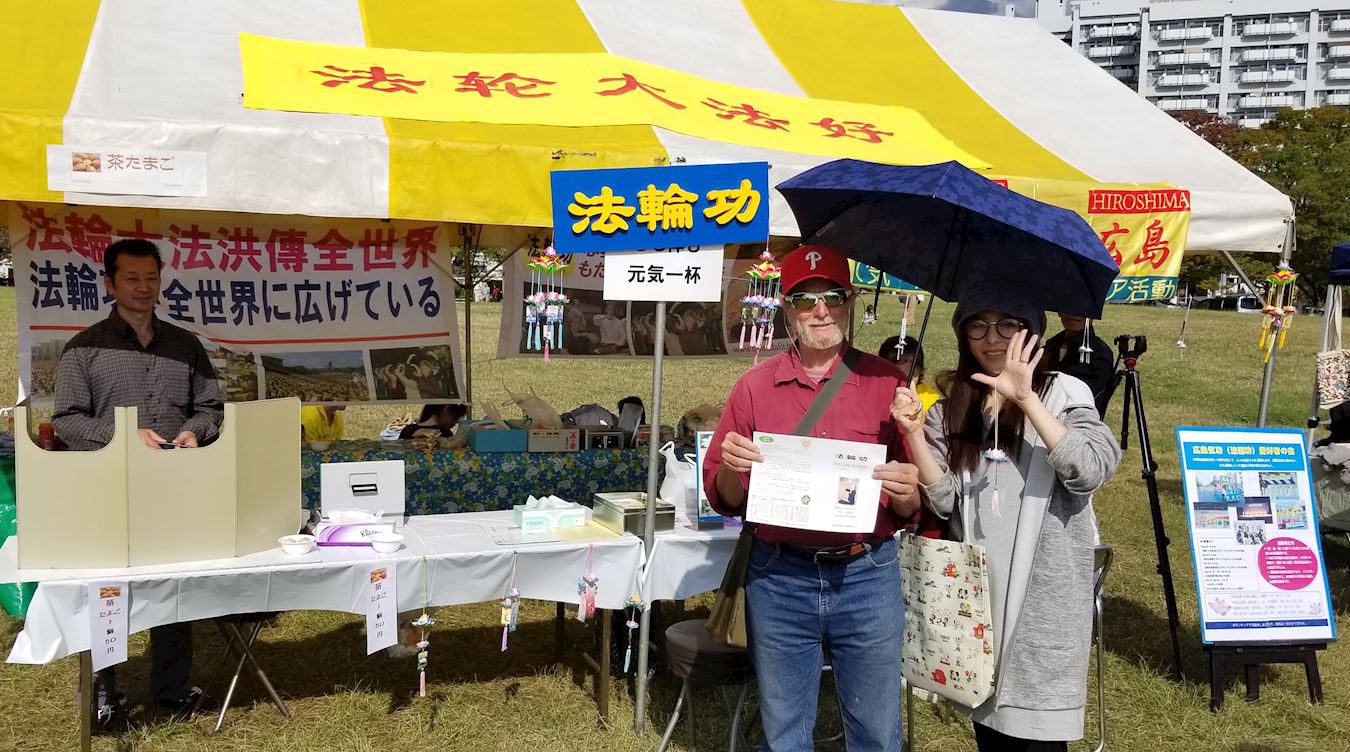 一位来日本三十年的美国人先生,退职前曾在广岛大学任教,他和夫人看完法轮功学员在舞台上的表演后来到展位前,想进一步了解了法轮功,临走前说:“(你们)在舞台上的表演太精彩了,希望你们加油!”
