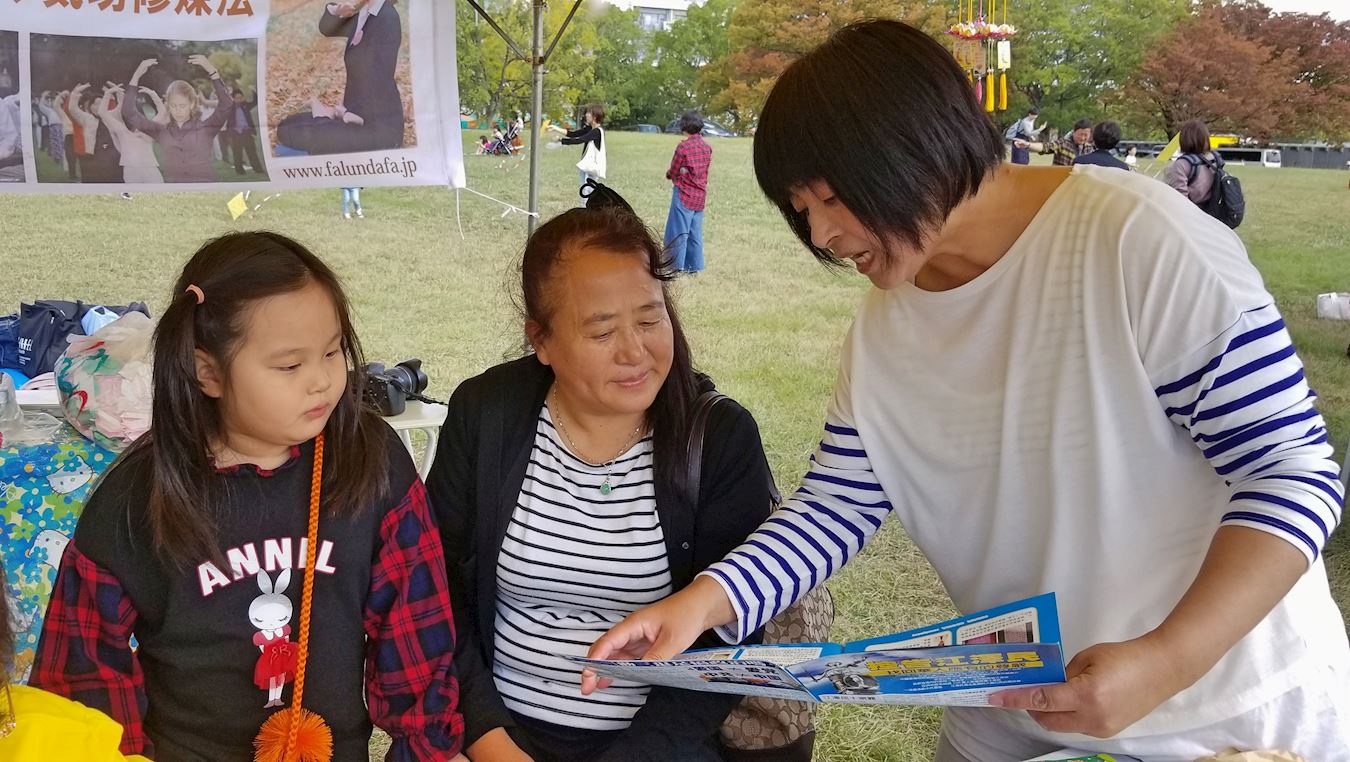 有一位华人长者来到展位前,法轮功学员问他知道法轮功吗?他说:“法轮功我知道。但是那个中共政权不让炼哪。人家健康你还不让啊。”还有一位华人女士带着孩子来到展位,了解了法轮功被迫害的真相后,表示退出了以前加入的少先队。