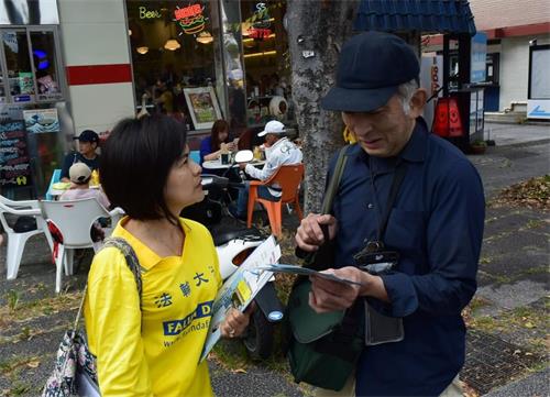 有学员在路边向行人介绍法轮功,每天在樱木町车站上班的川崎先生表示知道法轮功在中国遭受迫害,但不知道竟然还有活摘器官的事情。他认真询问了横滨炼功点的情况后才离开。