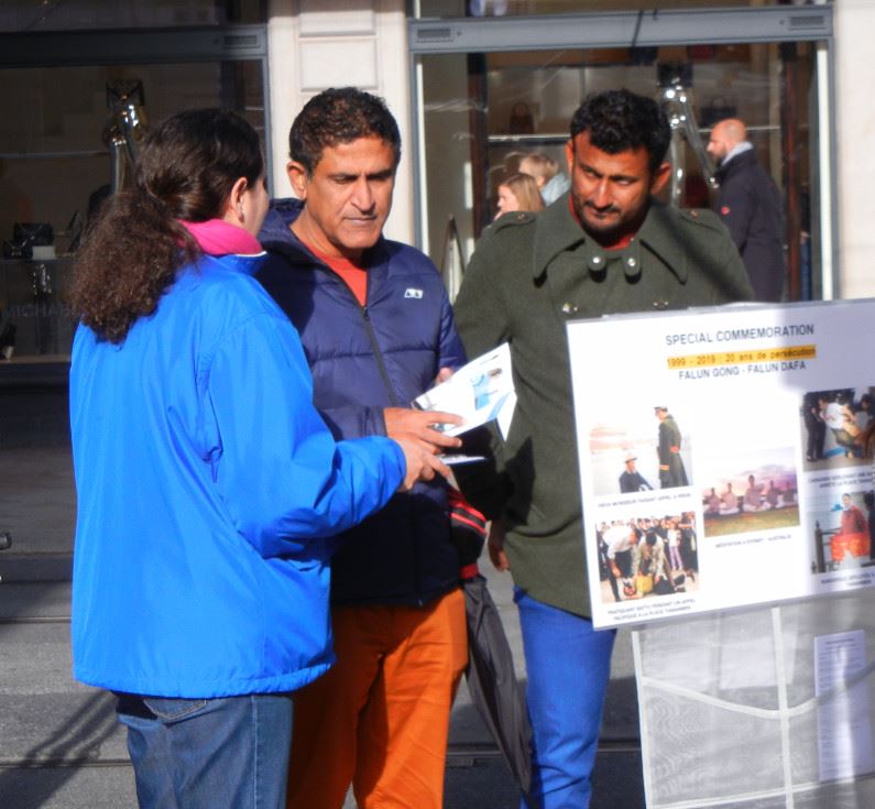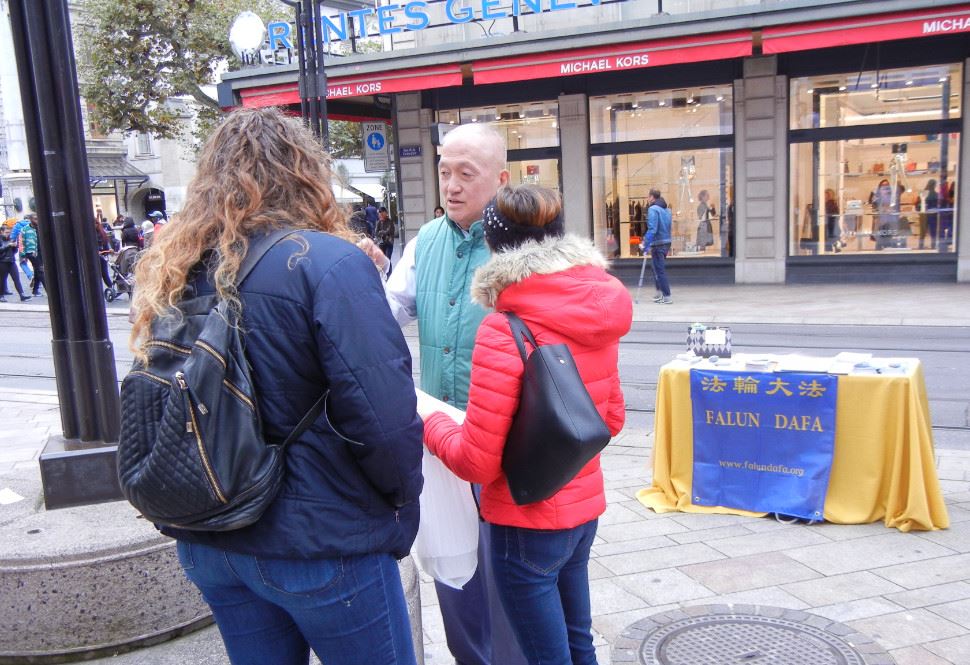有一对瑞士中年夫妇和一位女士,一同听取了法轮功学员的介绍之后说,他们知道法轮功是一个很好的修炼方法,不收费,来去自由,他们也想学习。同时他们也知道,法轮功在中国国内是受迫害的,而且法轮功学员被活摘器官,他们完全支持法轮功的反迫害活动,并且在征签表上签名。当那位妻子签完名后,她丈夫表示,妻子可以代表他,但是妻子马上表示,这个我可不能代表你,你必须自己签名才行,丈夫就亲自签上了自己的名字。最后他们还都拿了介绍法轮功的材料,那一对夫妇还表示,想让他们不安宁的儿子和他们一起修炼,也许通过打坐会使他安静下来。