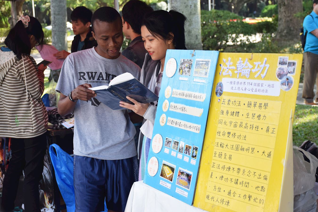 一位深色肤色的小伙子在摊位一侧约莫半小时之久,时而蹙眉不语,似在思考,时而翻看英文版《转法轮》(法轮大法创始人李洪志先生主要著作之一)。这位学生来自迦纳,他说,“经过介绍法轮大法的摊位时,被炼静功的能量场吸引而来,感到这位学生炼功时很平和(Peace)。”一位来自越南,名叫Lynn Trinh的年轻女士与他交谈。Lynn刚开始修炼法轮功六个月,为了要用中文了解法轮大法经书的准确含义,她特别来台湾学习中文,目前在淡江大学学习中文二个月。