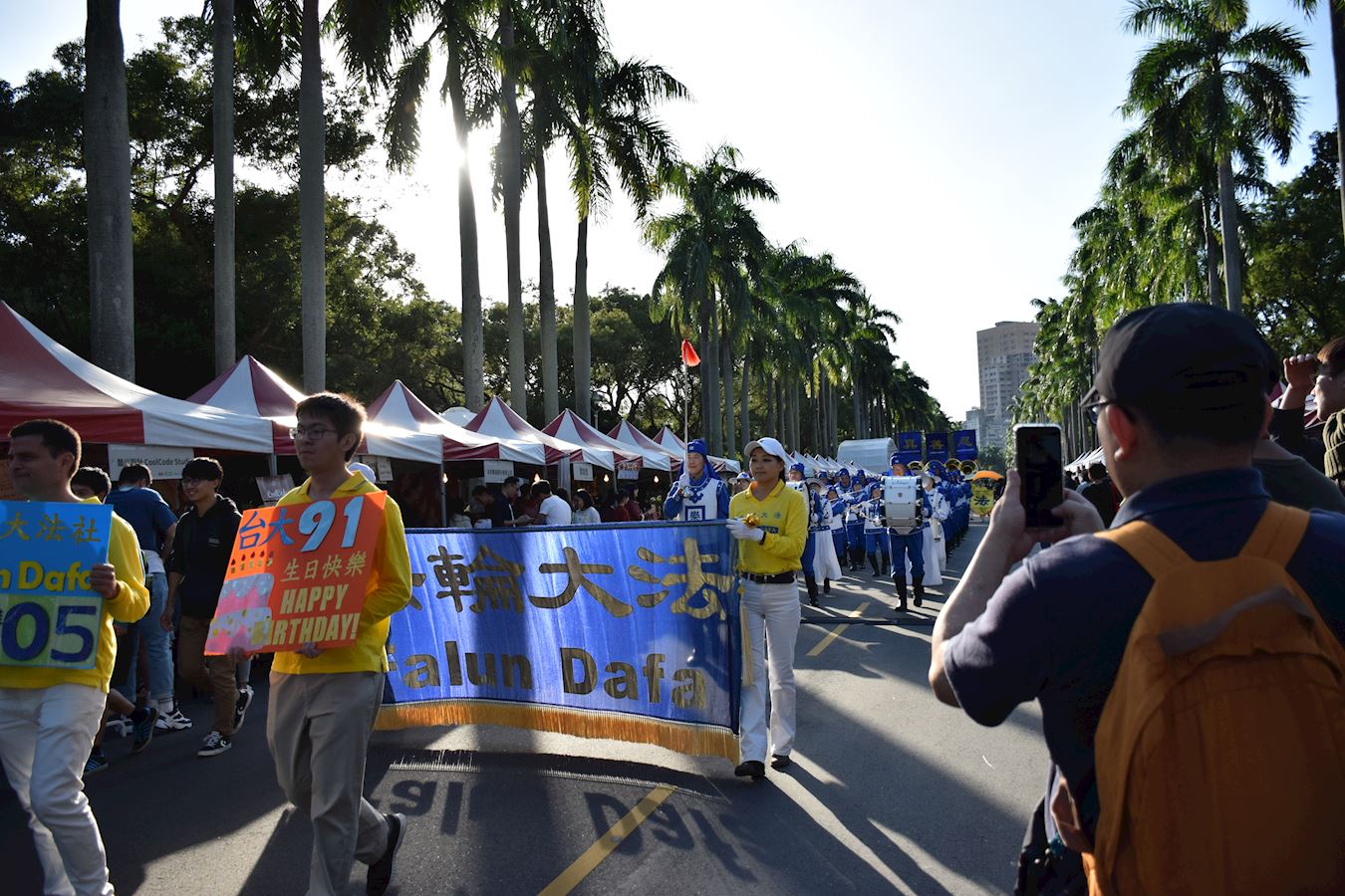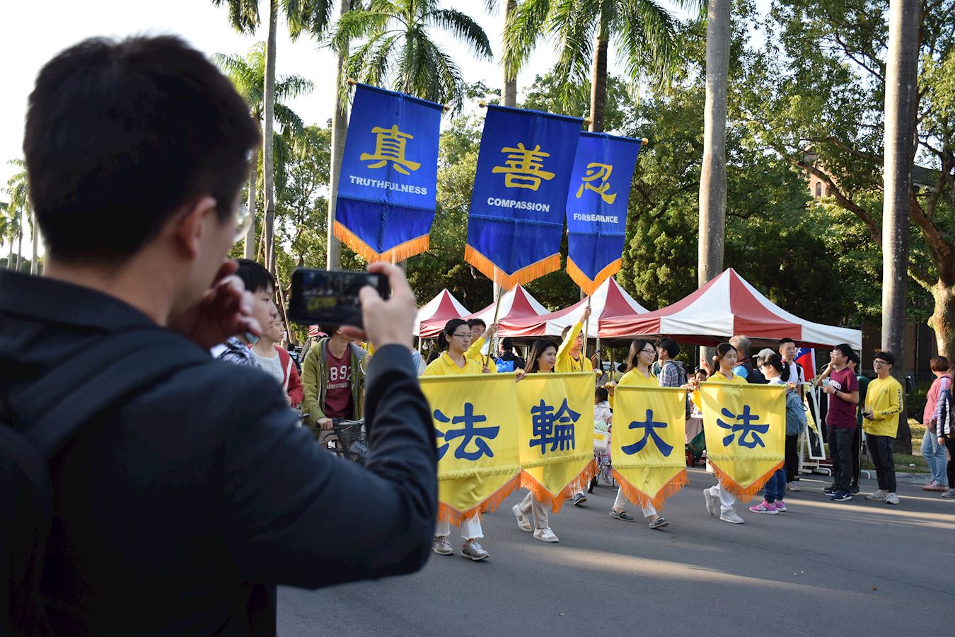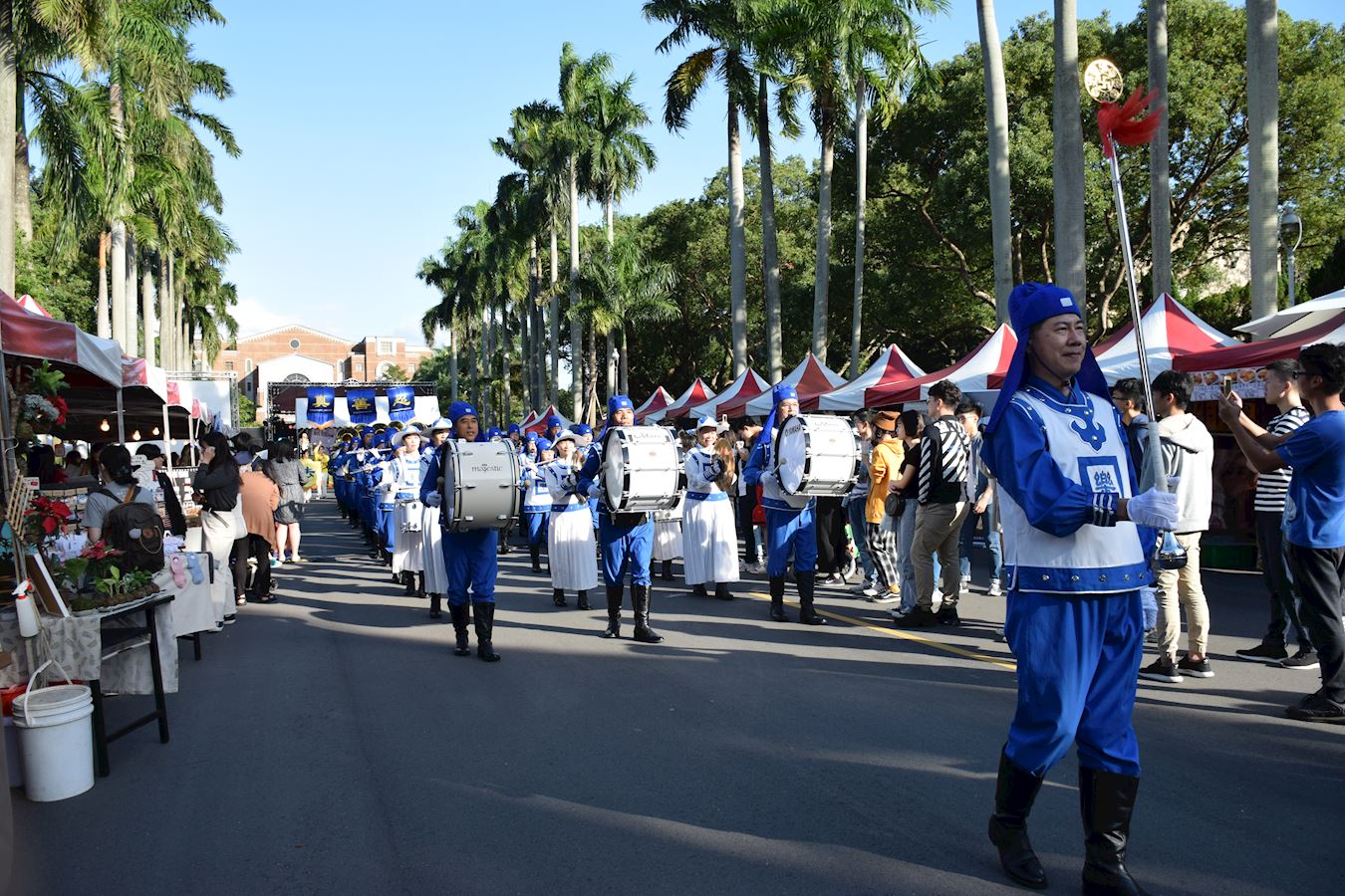 上午的动态游行,集结五花八门的社团一起在椰林大道上游行,大学生的青春活力在游行中展露无遗。为了吸引目光,游行队伍里有精灵古怪的装扮、有复古重机车队,还有点心美食队。法轮大法社团之黄底蓝字“法轮大法”及蓝底黄字“真、善、忍”罗马旗帜,显得平静与祥和,如金秋曙光,温暖和煦。