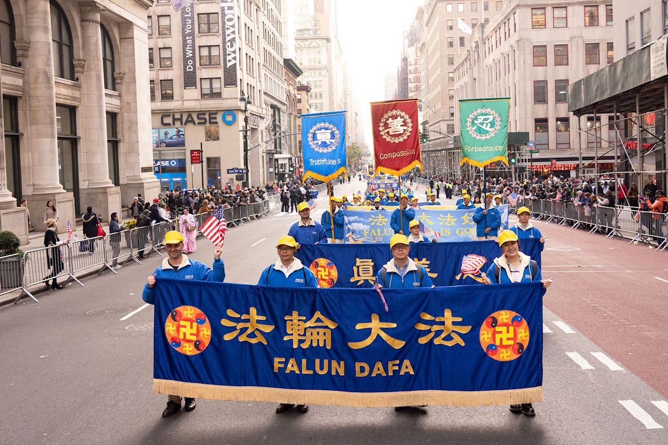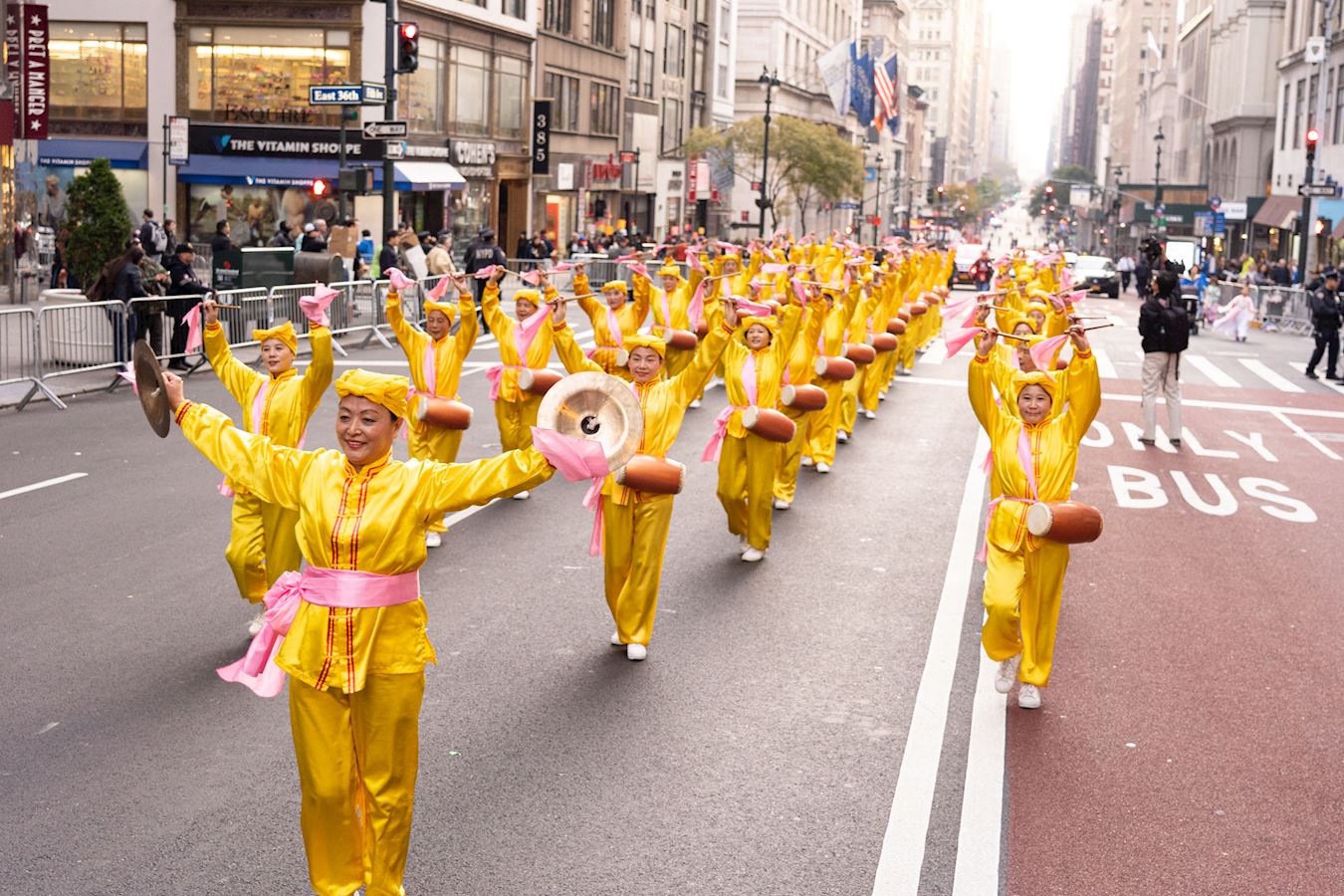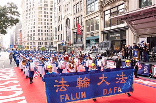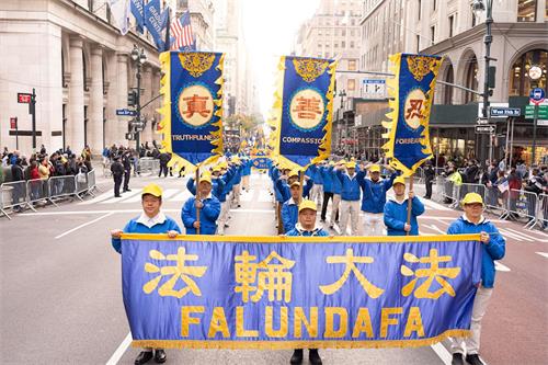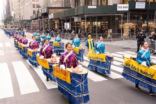 法轮功学员的游行队伍由天国乐团、仙女队、功法演示队和腰鼓队四个方阵组成。由一百多位法轮功学员组成的“天国乐团”军乐队。乐手们身着古代服装,威武英气,在主席台前红地毯上奏响了乐曲《法轮大法好》,之后乐曲《星条旗永不落》、《法正乾坤》、《神圣的歌》、《法鼓法号震十方》、《凯旋》、《送宝》响彻在繁华的第五大道上。学员们手持写有中英文“法轮大法好”、“真善忍”的横幅,队伍阵容整齐,成为游行中一道独特的风景线。队伍所到之处,许多观众纷纷表示赞叹。