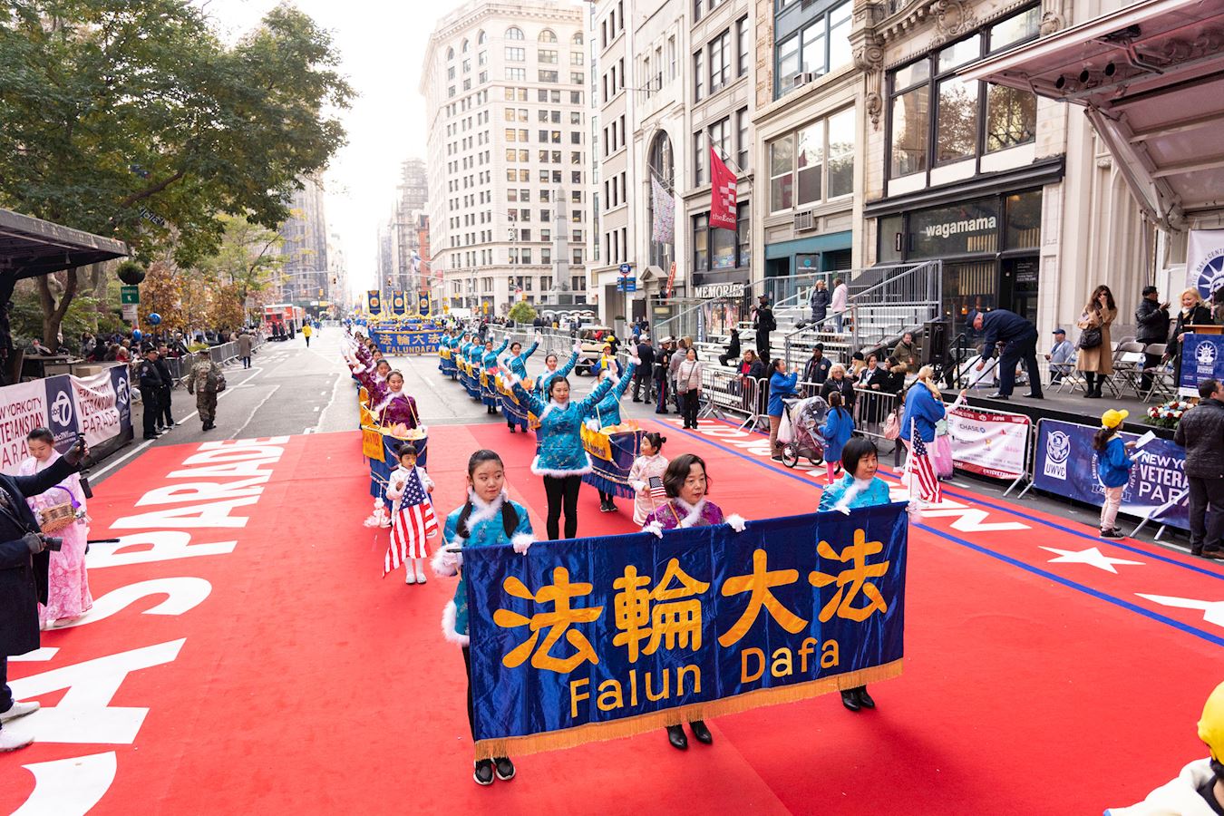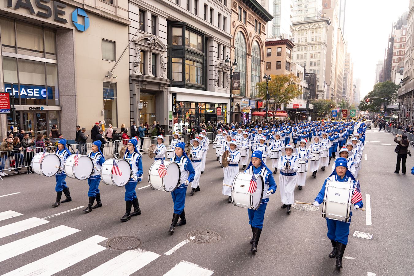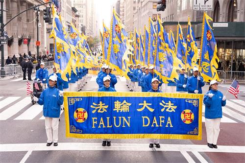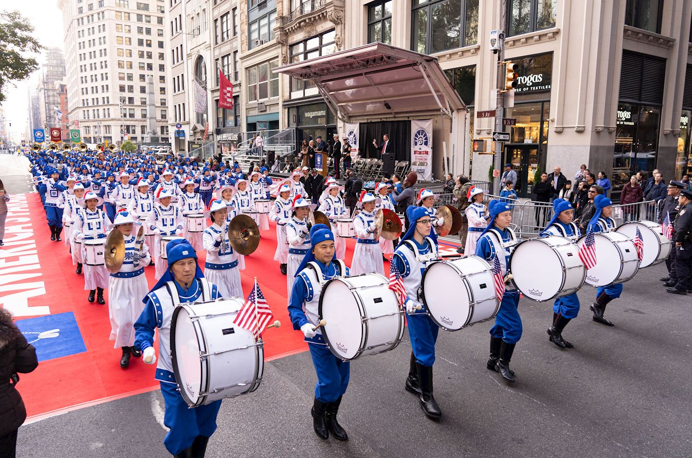 法轮功学员的游行队伍由天国乐团、仙女队、功法演示队和腰鼓队四个方阵组成。由一百多位法轮功学员组成的“天国乐团”军乐队。乐手们身着古代服装,威武英气,在主席台前红地毯上奏响了乐曲《法轮大法好》,之后乐曲《星条旗永不落》、《法正乾坤》、《神圣的歌》、《法鼓法号震十方》、《凯旋》、《送宝》响彻在繁华的第五大道上。学员们手持写有中英文“法轮大法好”、“真善忍”的横幅,队伍阵容整齐,成为游行中一道独特的风景线。队伍所到之处,许多观众纷纷表示赞叹。