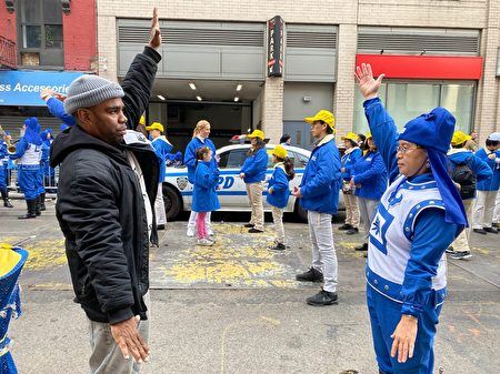 来自纽约布朗士的麦克(Mike)来到法轮大法的游行集合地点,找学员要学炼法轮功功法,他兴奋地说了两遍:“我要学炼法轮大法”。