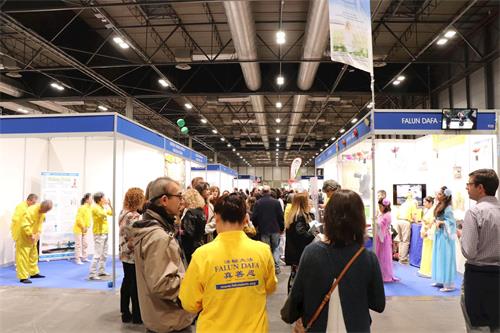 在熙熙攘攘的各色展位中,法轮功学员代表的中国气功法轮功对很多西方人来说尤为特别。伴随着优美舒缓的炼功音乐加上飘逸流畅的功法演示,经过展位的行人,从注重养生的老年人到天真无邪的孩童,都停下脚步专注观看,很多小孩主动比划着学了起来。