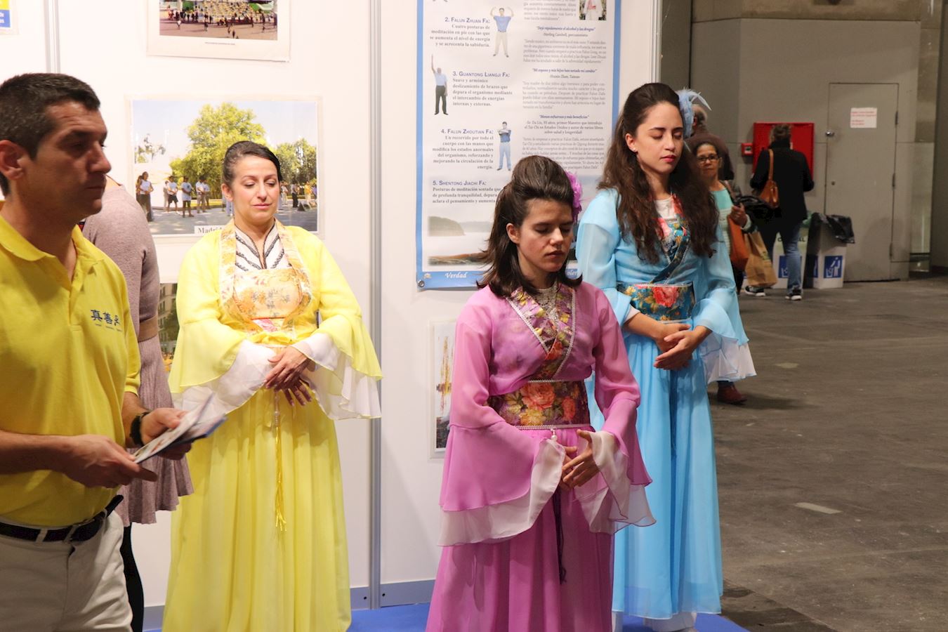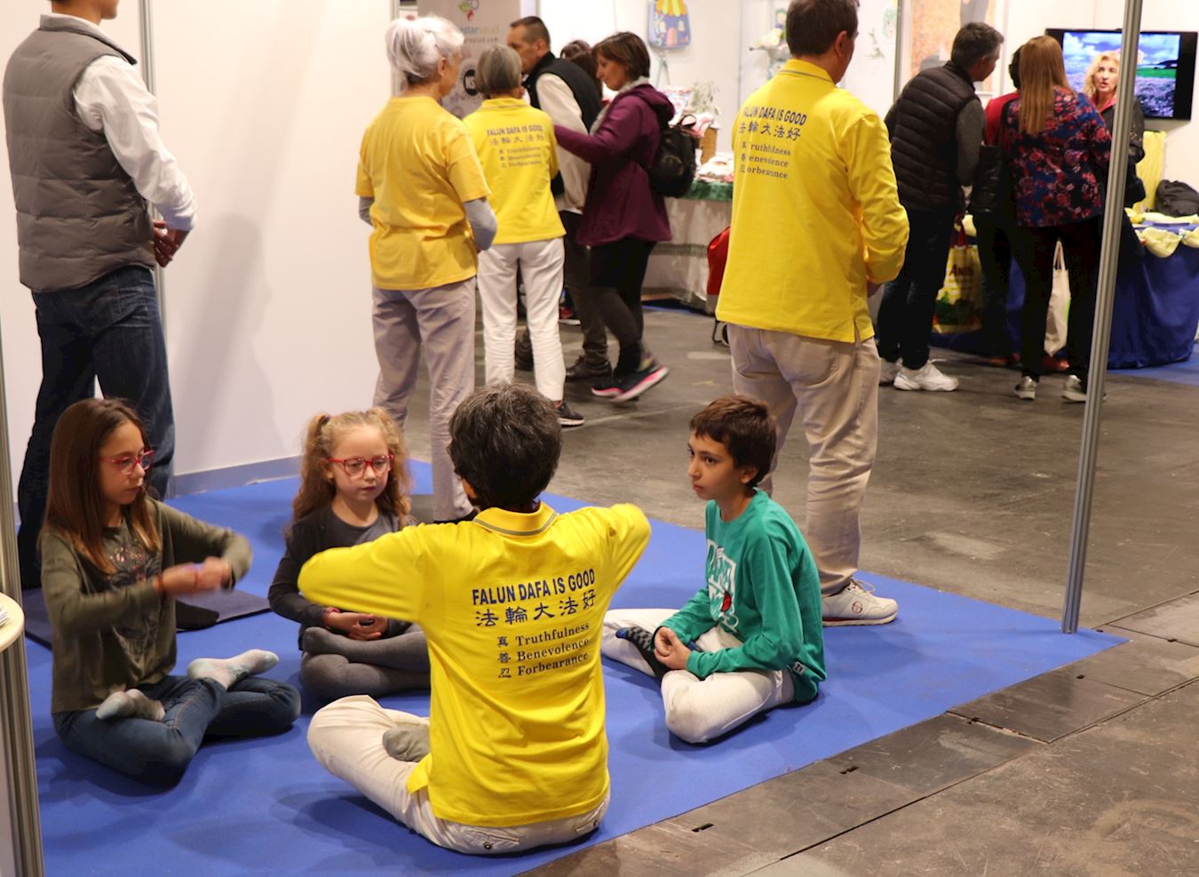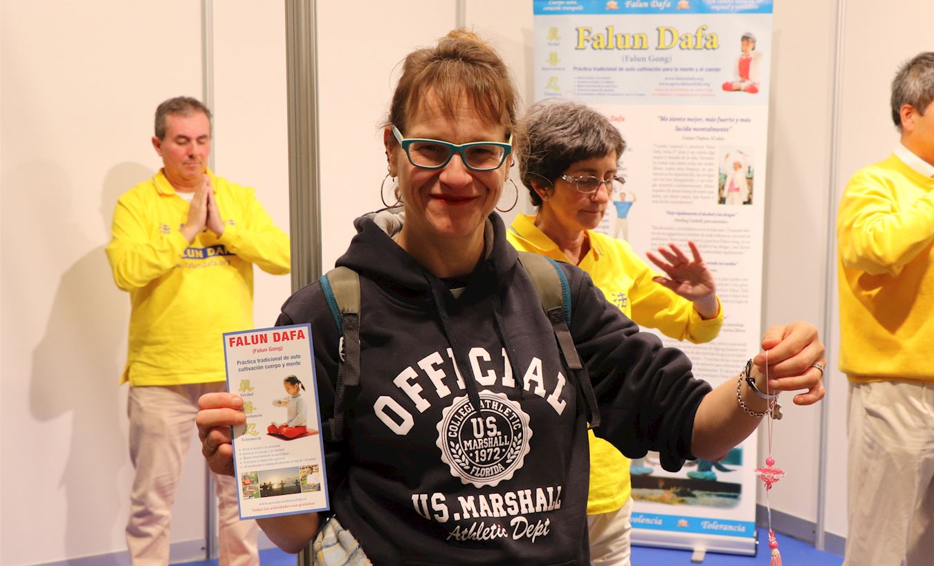 一位从西班牙海岛卡娜瑞尔斯(Canarias)远道而来的女士,在逛完了展会大厅几乎所有的摊位后,停在了法轮功学员的展位旁,她目不转睛地看着法轮功学员的功法演示。拿到传单后,她告诉法轮功学员,在这里形形色色的众多的展位之中,只有法轮功传达的信息真正打动了她的内心深处,这种感觉就是她一直在寻找的。