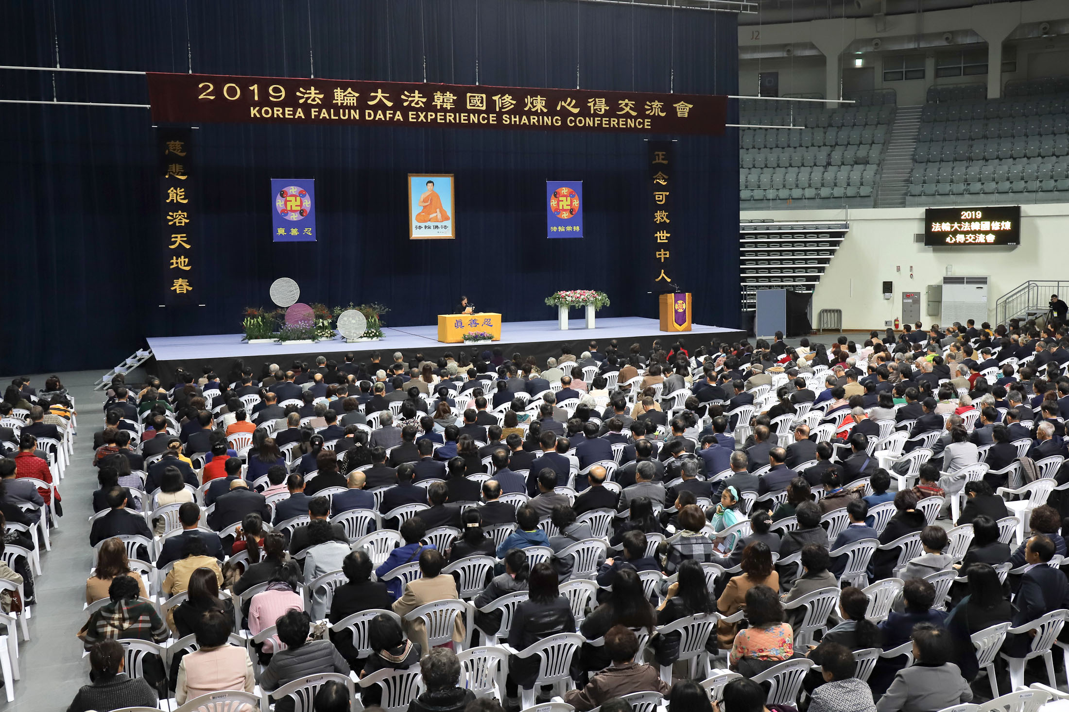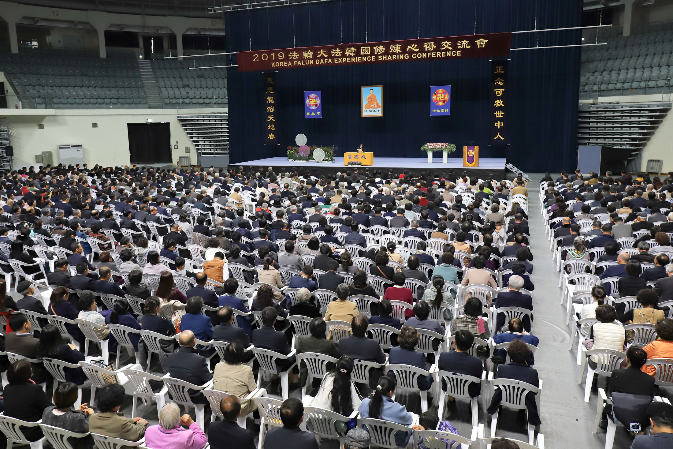 【明慧网二零一九年十一月十四日】二零一九年十一月十日,来自韩国各地的约一千一百名法轮功学员在首尔中心的奖忠体育馆召开了“二零一九法轮大法韩国修炼心得交流会”。在庄严神圣的法会场中,十三位新老学员讲述了他们修炼法轮功后身心受益,如何实践真善忍,以及因此受到世人认可的经历,过程中,见证法轮大法已深植韩国,为韩国人带来福祉,他们深深感恩李洪志师父。