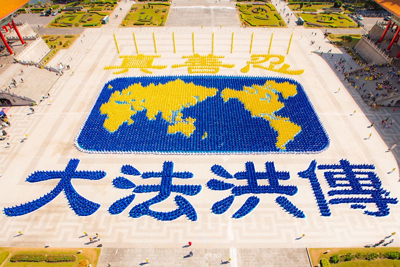 今年的图形主题是“法轮大法洪传世界”,整幅图形宽度八十八公尺、深度一百零一公尺。全图上方的“真善忍”三字是法轮功学员在修炼中的最高指导原则,也是深植人心的普世价值。图形中间的世界地图衬托出图形下方“大法洪传”的盛况。灿烂阳光辉映着“法轮大法”的佛恩普照,将“真善忍”的福音传送宇宙方圆各地,无远弗届。排字场面壮观殊胜,吸引各国游客驻足观看、拍照留念。