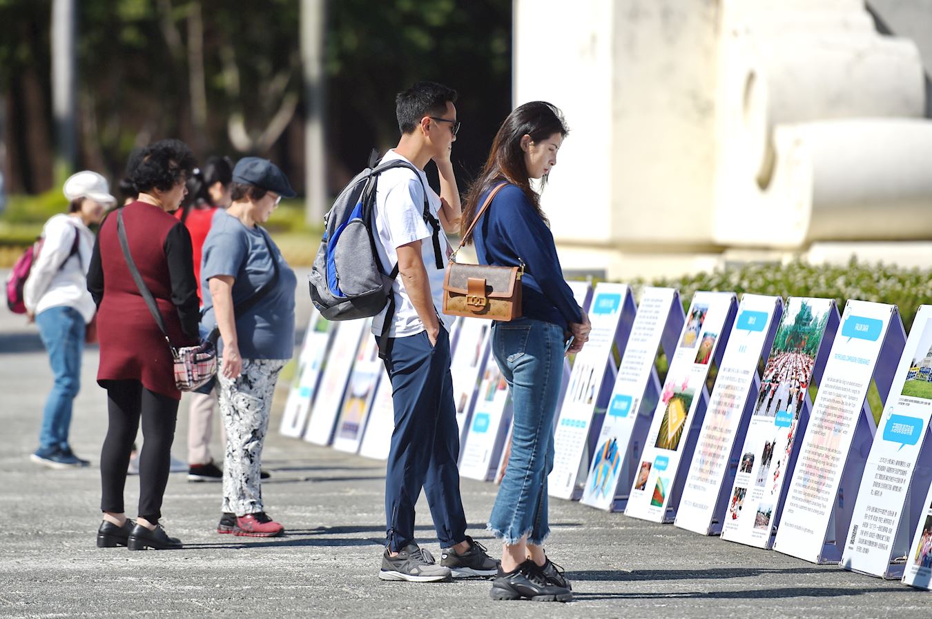 ![]() 图7~10:自由广场上,法轮功真相展板吸引游客关注。 |