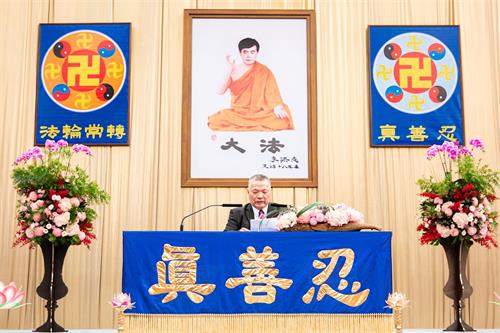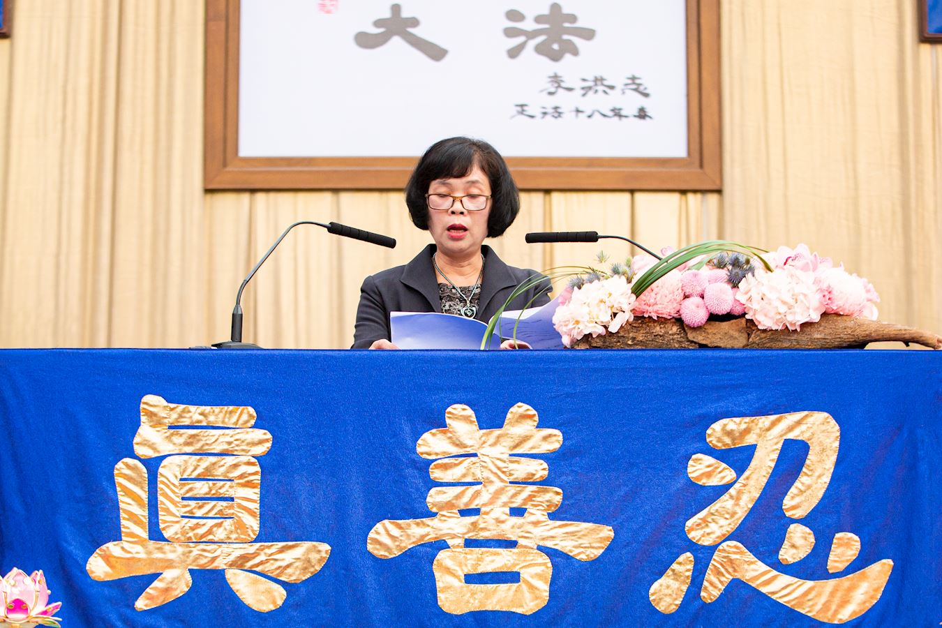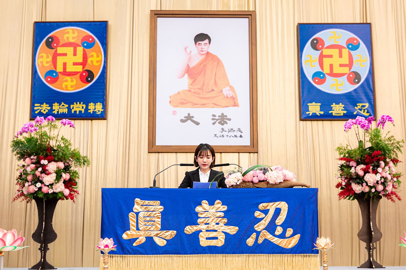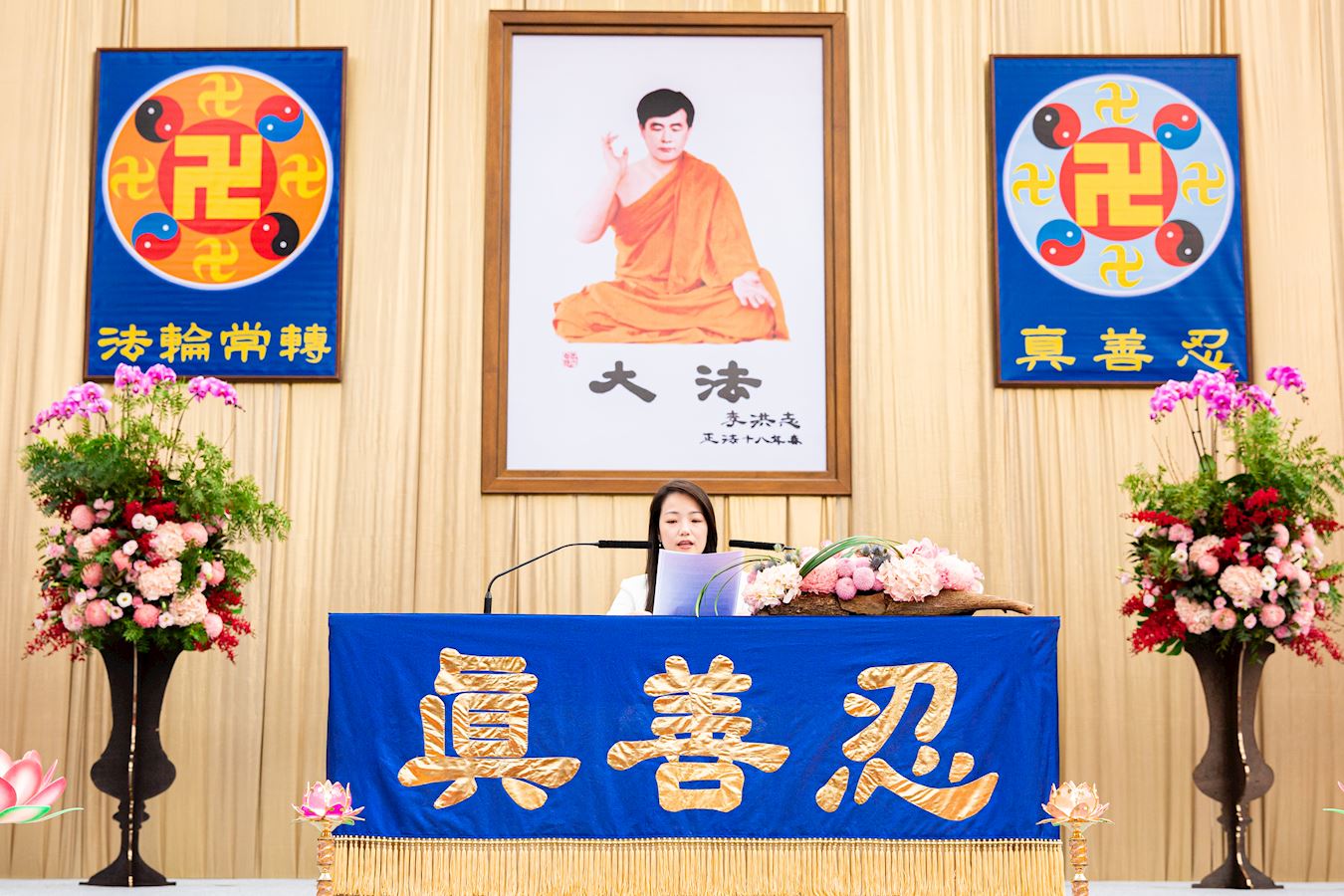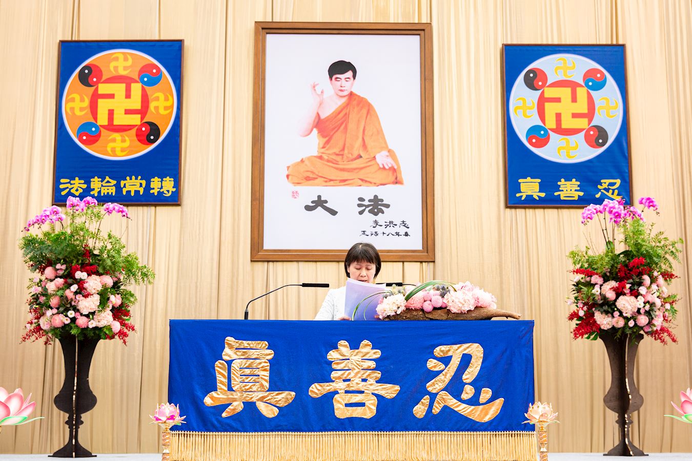 主席台正中央高挂李洪志师父法像与“真善忍”、“法轮常转”两面法轮图形;师尊的词句“慈悲能溶天地春 正念可救世中人”[1]高悬两侧,还有多面蓝底金字的横幅上印着《洪吟》中的诗词环绕全场,激励着所有的学员,法会会场气氛祥和、庄严。