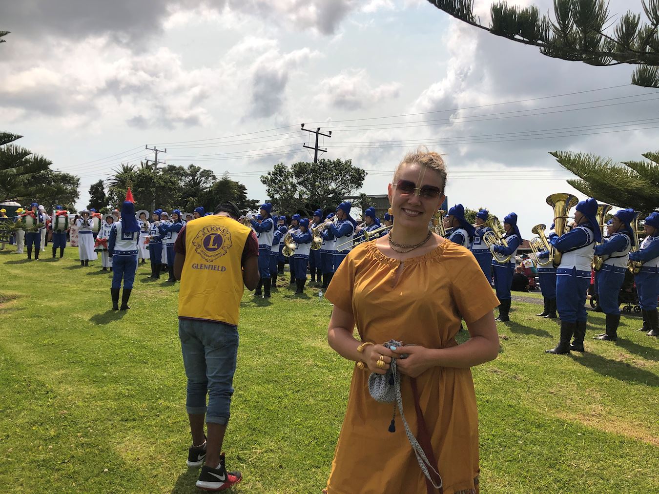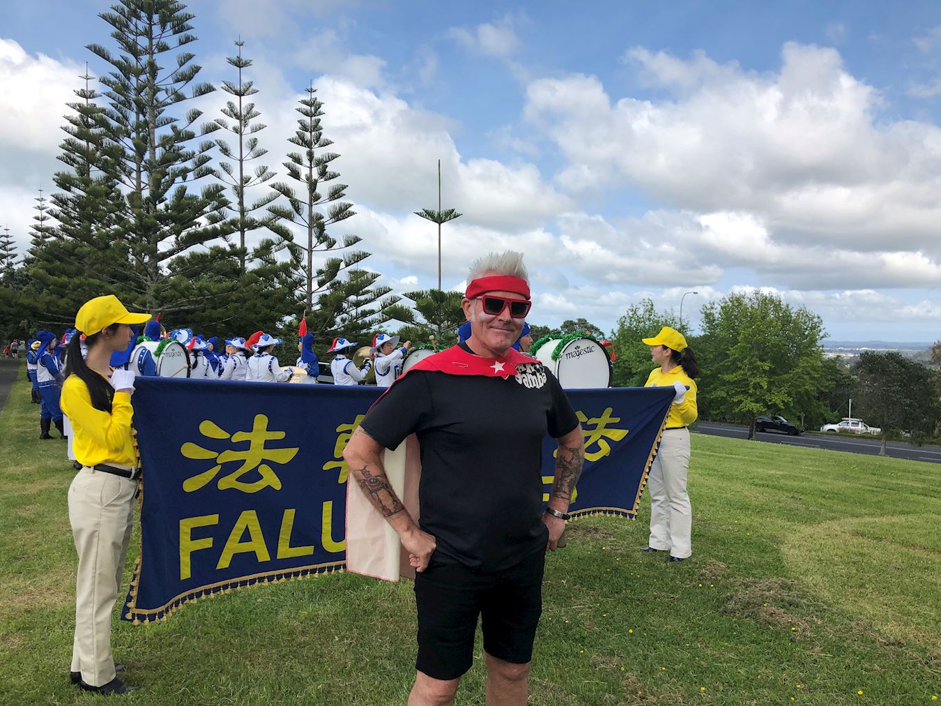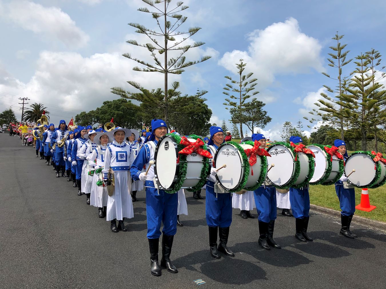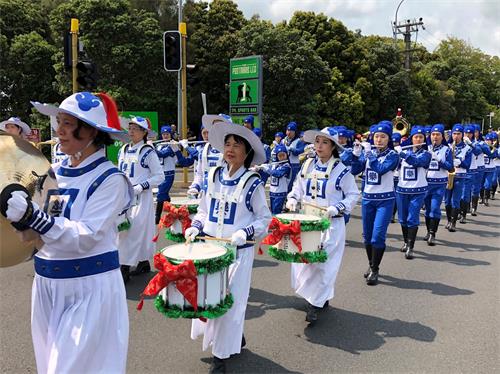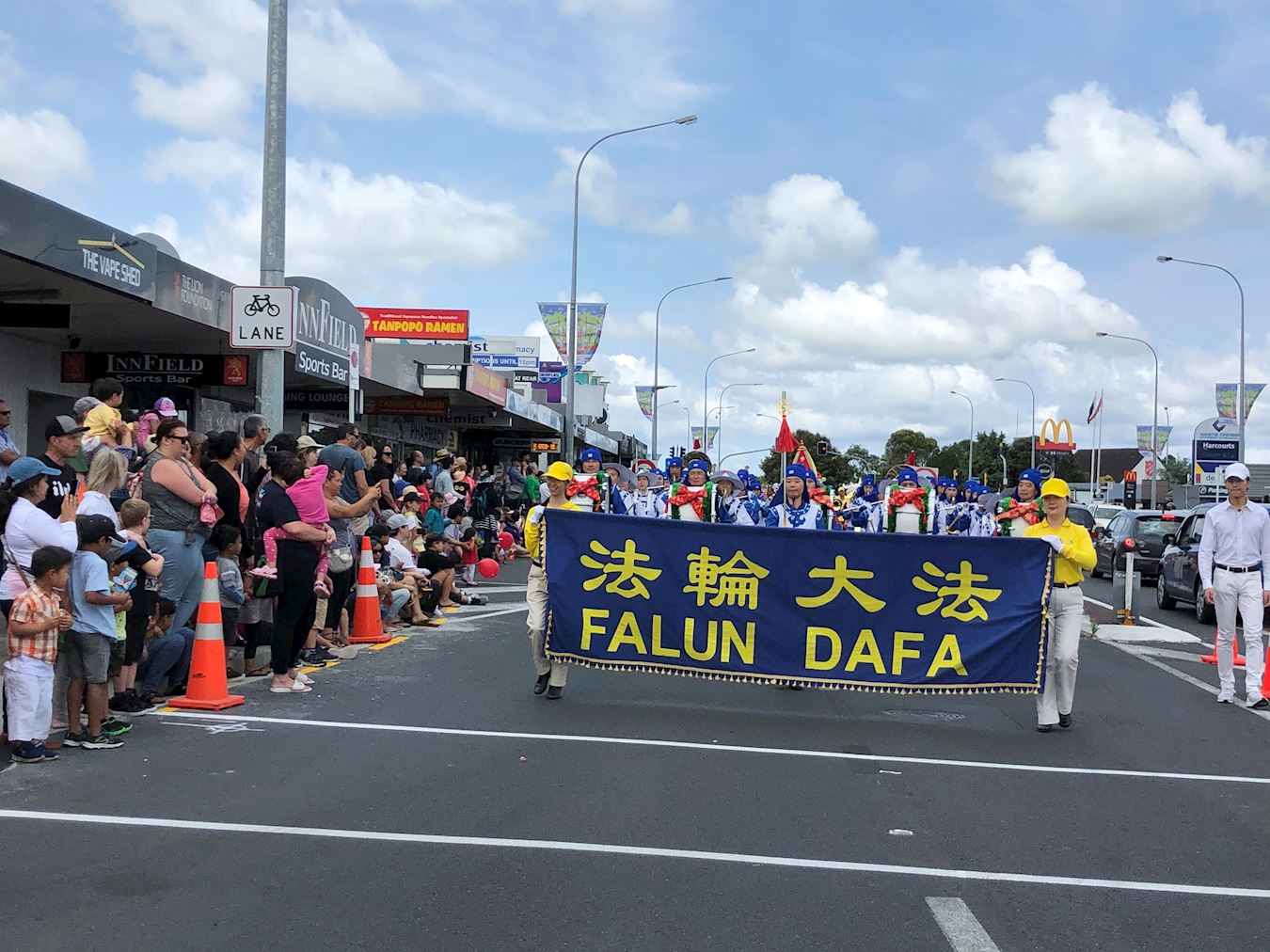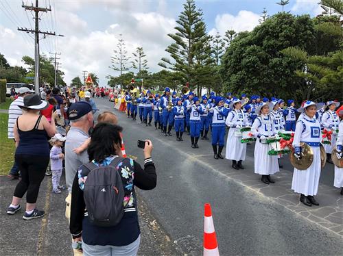 游行队伍于早上十一点整出发,只见一路上街道两旁,人们脸上洋溢着节日的笑容,小孩子们更是欢呼雀跃。由法轮功学员组成的新西兰天国乐团演奏《法轮大法好》,《法鼓法号震十方》,《法正乾坤》,《送宝》,《法轮圣王》,《佛恩圣乐》,《凯旋》,《神圣的歌》,《欢乐颂》等乐曲。天国乐团经过时,两旁观众有的鼓掌致意,有的录像,有的拍照,也有随着音乐节拍舞动的。