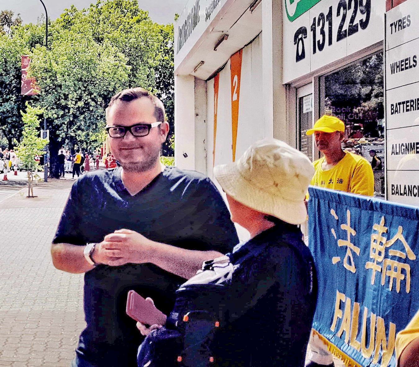 ![]() 图6:韦德(Wade)很高兴法轮功学员在澳洲可以自由参加社区活动,分享修炼的快乐。 |