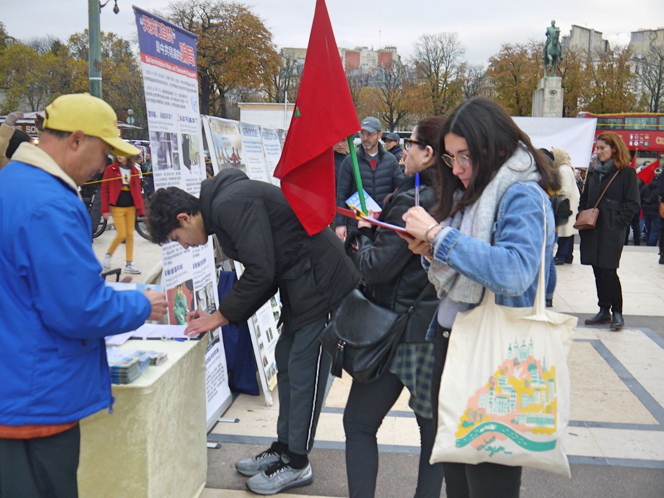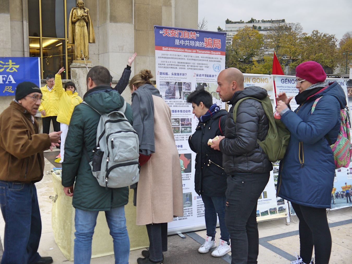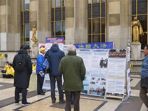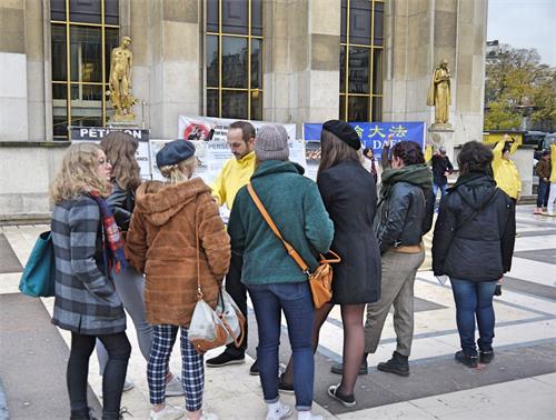二零一九年十一月十日和二十四日两个周日下午,法轮功学员在巴黎人权广场继续进行展示法轮功功法和讲真相的活动。来自比利时的阿弥德在活动现场停留了很久并对修炼法轮功表示出极大的兴趣,跟法轮功学员攀谈。