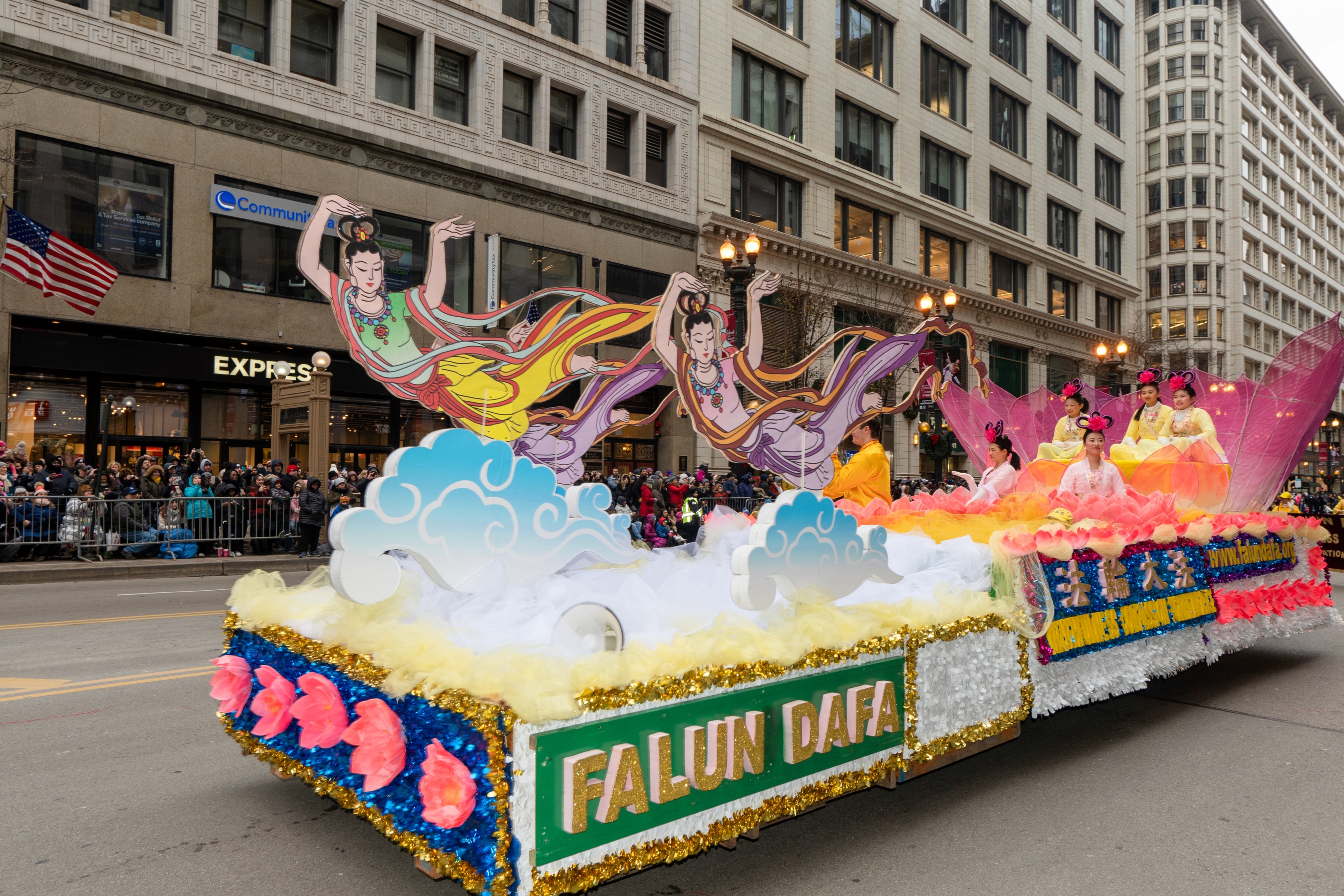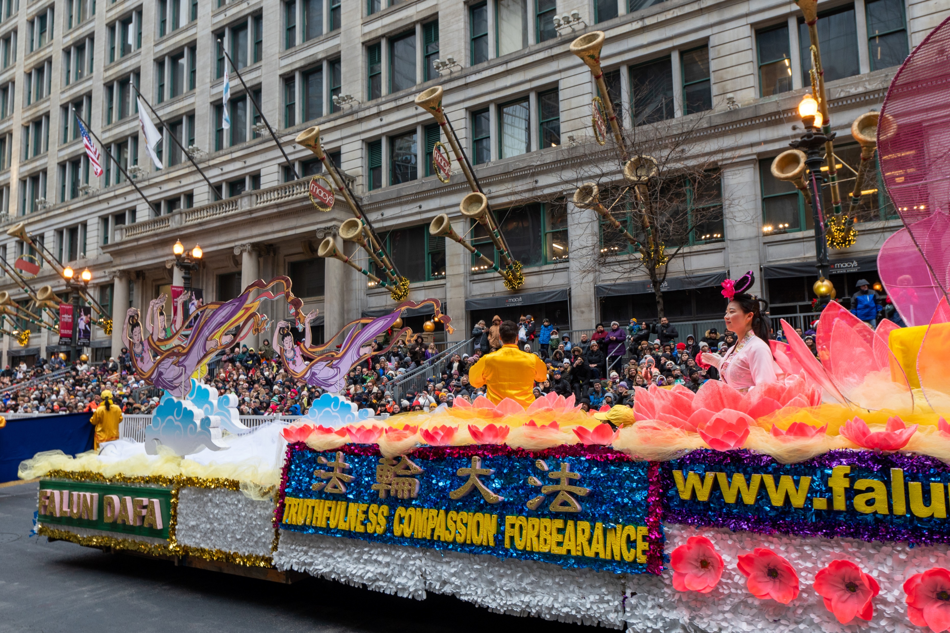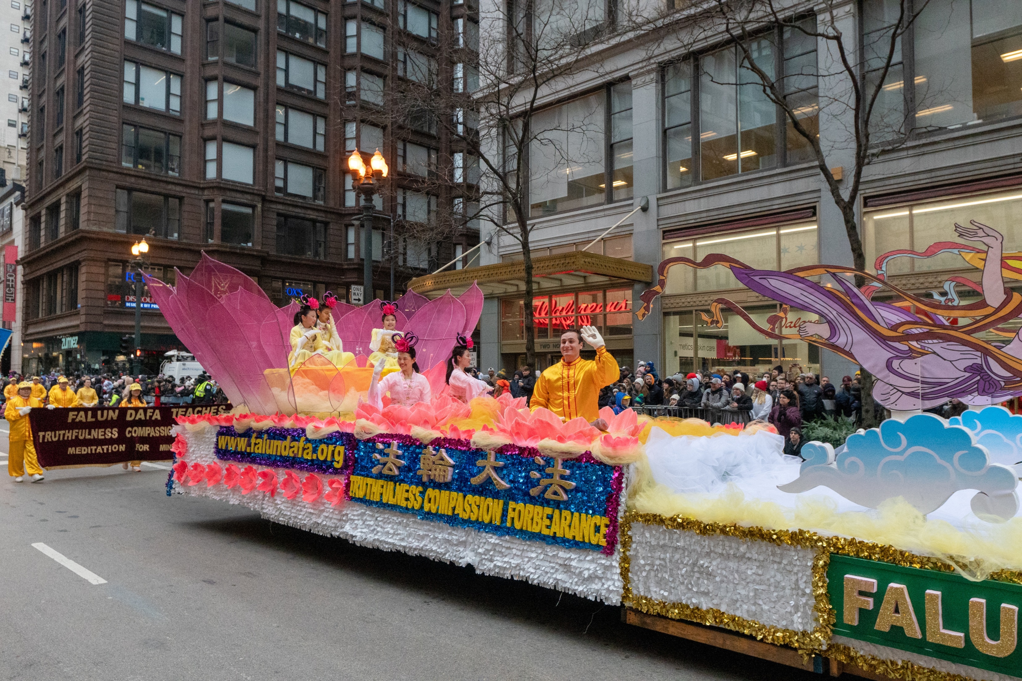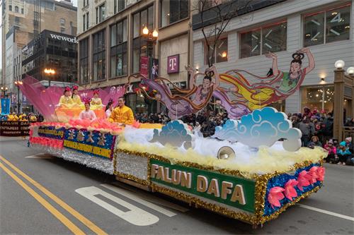 美中法轮大法学会是第一个应邀参加该游行和表演的华人团体,今年已是连续十七年参加大游行。多年来,法轮功学员精心设计的各款花车备受组委会青睐,今年排在整个游行队伍的前面,是Teddy The Turkey 火鸡后的第一个游行团队。色彩绚丽的花车令观众们赞叹不已,“很平和、很美丽、很美好”,“很有中国味”。有观众随着法轮功学员的炼功方阵学炼起来。