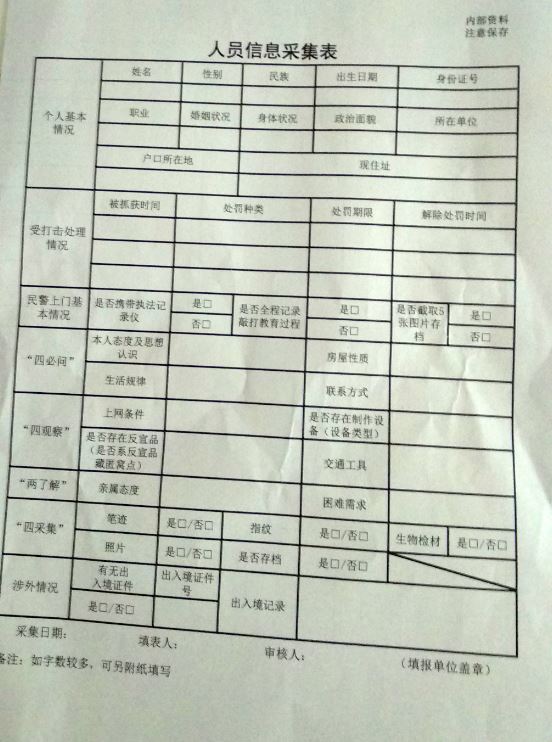 【明慧网二零一九年十二月二十五日】〖大陆来稿〗这是中共派出所警察非法到一位法轮功学员家强制采集个人信息要求填的表。所谓的“四必问”、“四采集”、“四观察”是明目张胆的侵犯公民的隐私权利。