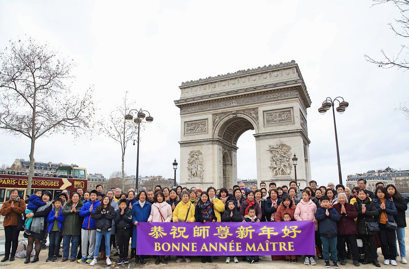 ![]() 图1:法国部份大法弟子在巴黎著名景点凯旋门,向法轮功创始人李洪志师父拜年,恭祝师尊新年快乐! |