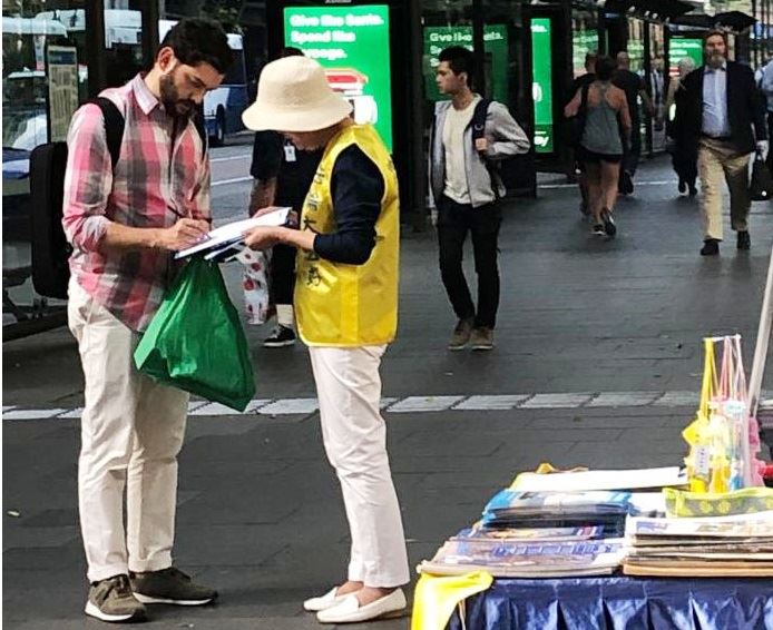 曾在澳大利亚银行业供职的澳洲人拉克兰·布朗(Lachlan Brown)先生下班途径法轮功展位时主动过来在给澳大利亚政府的请愿书上签名。他说:“如果我没有理解错的话,法轮功因为信仰而遭受迫害。我认为,澳洲有很多华裔澳大利亚人居住在这里,这对澳洲政府来说对法轮功的支持和立场真的很重要,说我们不赞成(中共迫害法轮功)这样的做法,不会损害声誉,需要(跟中共)对话,我们才能帮到(法轮功)。”