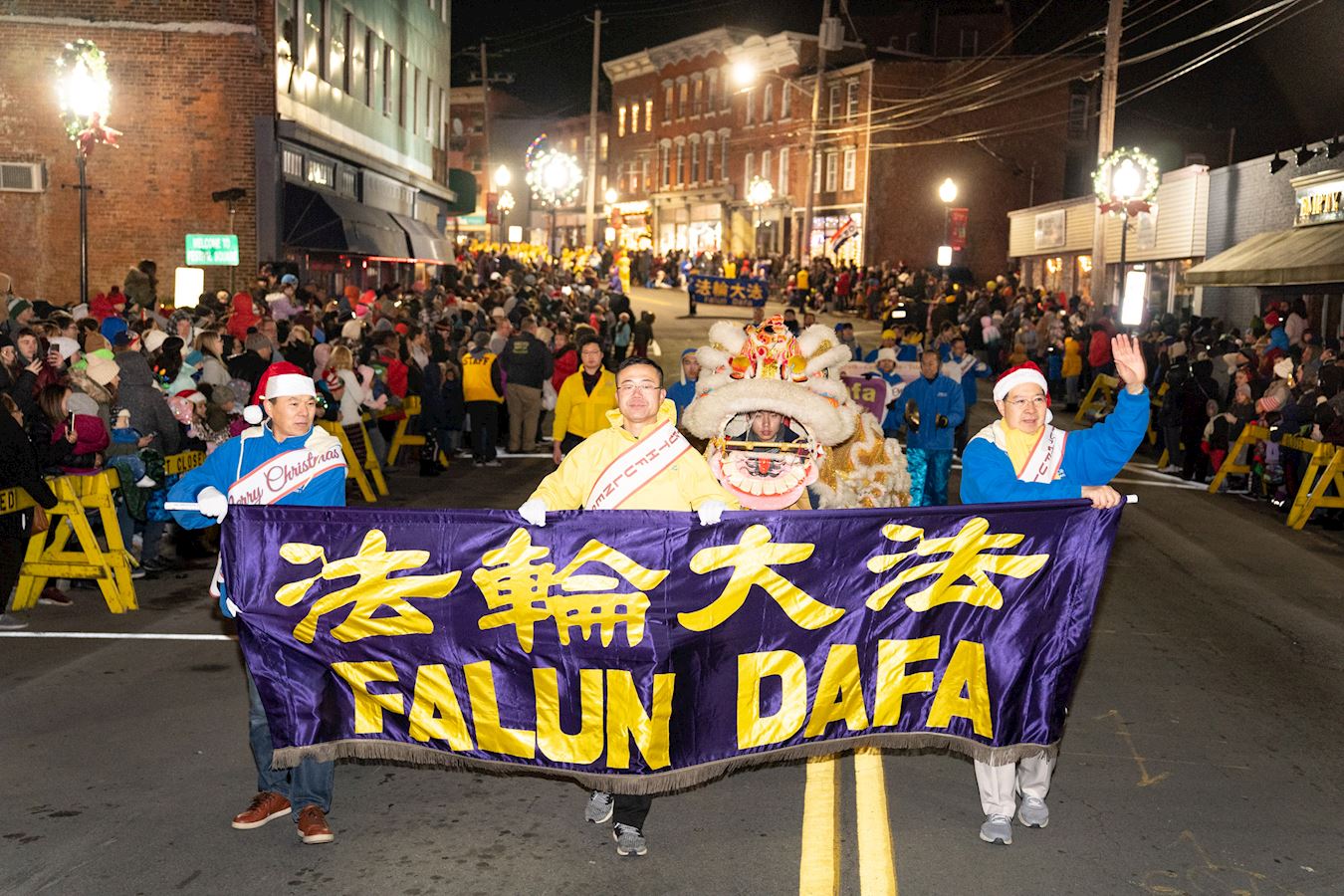 游行在米德尔敦北街的Run 4 Downtown Park至西街的节日广场(Festival Square)举行。古朴的社区民众看到法轮功队伍,象见到老朋友一样纷纷热情地打招呼。法轮功腰鼓队一身黄色亮丽的着装,以及节奏欢快的“咚咚咚”鼓声给节日带来特别的喜庆,“法轮大法好”的乐曲响彻在小镇的夜空。人们欢呼着,欢迎法轮大法队伍,孩子们更是喜不自胜地观看舞狮表演。
