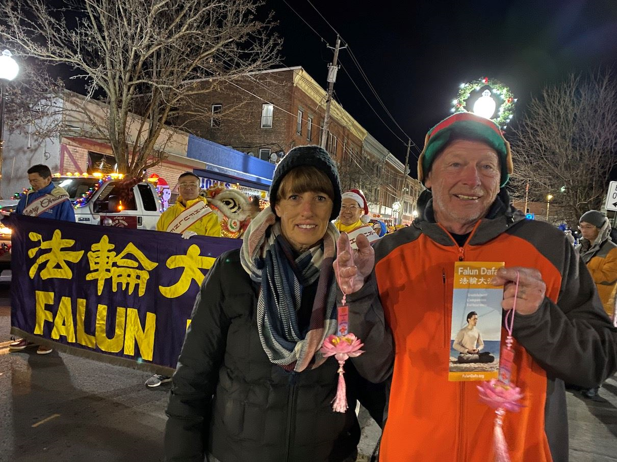 参加游行的艾德(Ed)夫妇手里拿着印有中英文“法轮大法好”的莲花吊坠,向法轮功学员表达:“我们家每年在这个活动的时候,都想着向你们要新的,每个人一朵新的,(莲花)很好,‘真、善、忍’给我们家庭带来了好信息。”