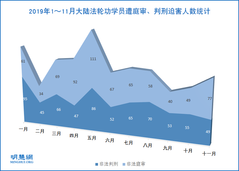 ![]() 图1:2019年1~11月大陆法轮功学员遭庭审、判刑迫害人数统计 |