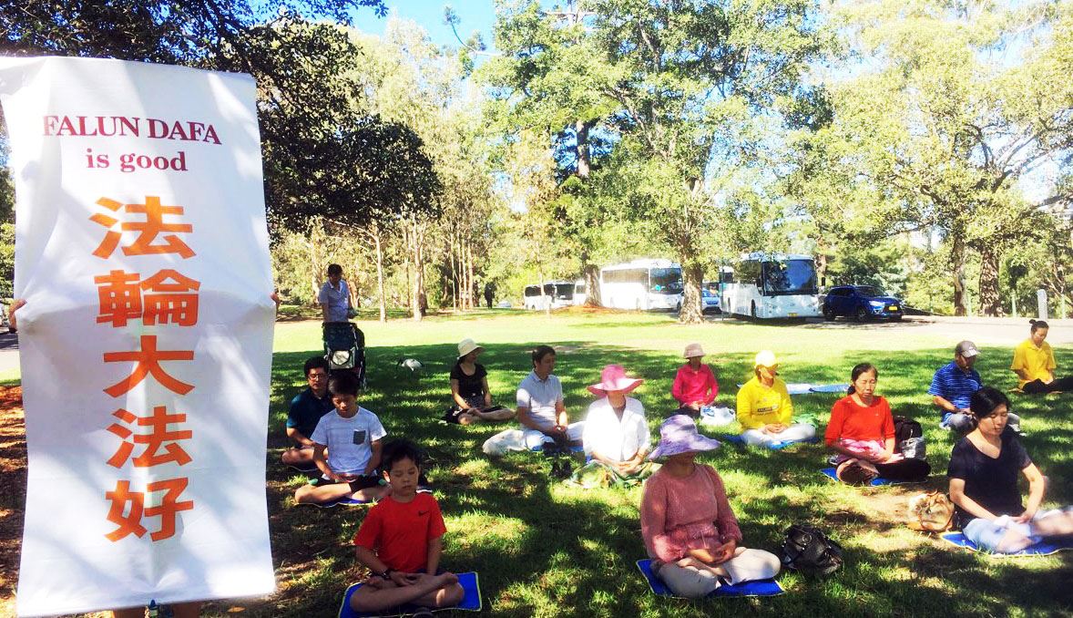 悉尼法轮功学员常年在这里向中国游客发放法轮功真相资料,举横幅,面对面讲真相,劝三:退.(退出中共党、团、队),风雨无阻。每个周末还有更多的学员在中间的草坪上展示法轮功的五套功法,给这里增添了一道独特的景观。