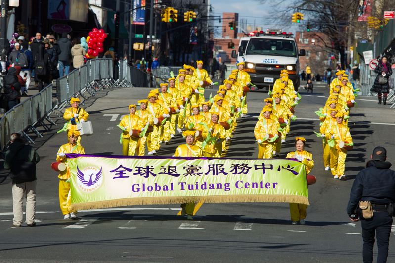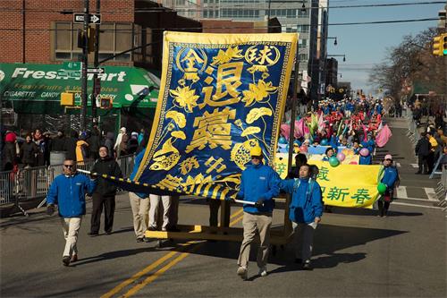 【明慧网二零一九年二月十二日】二零一九年二月九日大年初五,一年一度的纽约华人中国新年大游行在法拉盛隆重举行。上万人的游行队伍,载歌载舞;数万名各族裔观众,扶老携幼,驻足观看,共庆中国新年。全球.退:党!服务中心以其新颖别致的“凤凰”花车设计,向民众传递着重大喜讯:选择三:退.(退出中国共产党、共青团、少先队),生命将获得美好未来。当天有三百零九位华人声明三:退.。