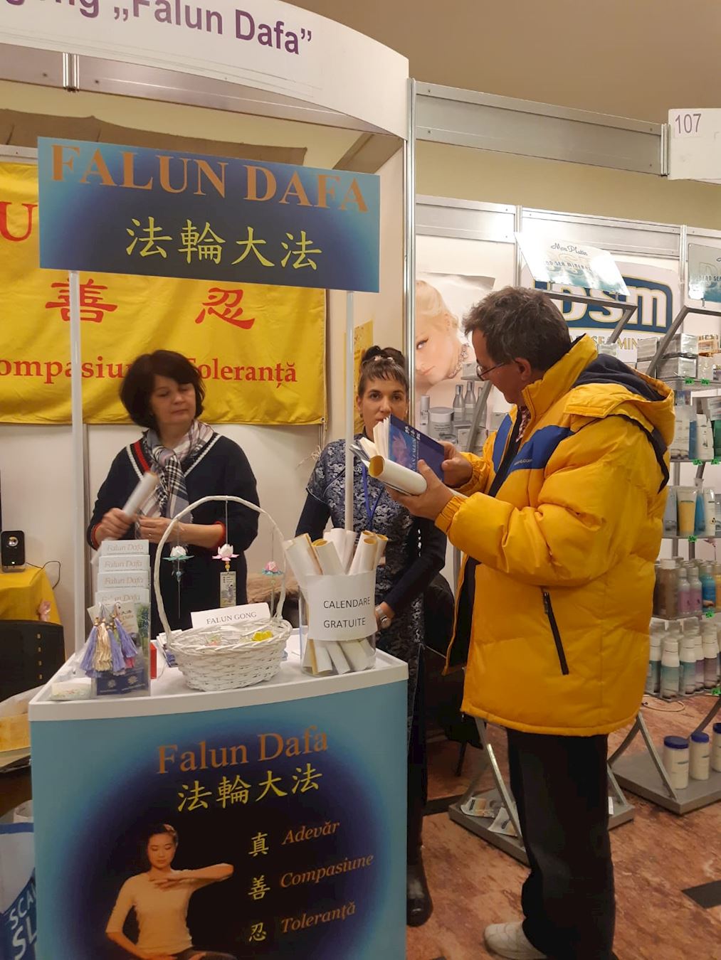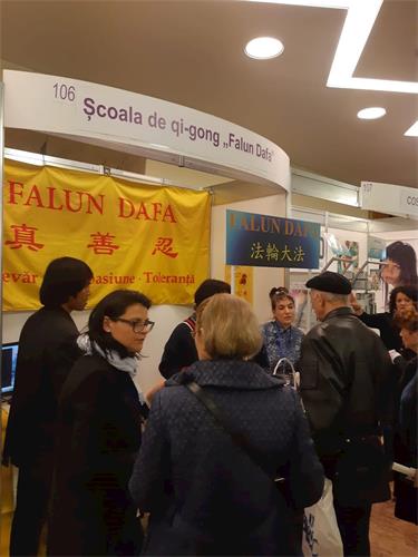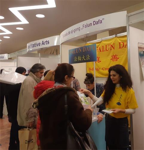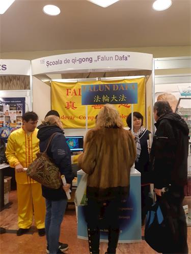 这次法轮功学员们在博览会大厅的一楼租了一个摊位用来介绍法轮大法,并有机会每天下午四点在舞台上展示法轮功五套功法。部份学员在大厅门口、楼梯口和展位上为来往民众发资料讲真相。还有学员为大家发自制的日历、莲花和书签。